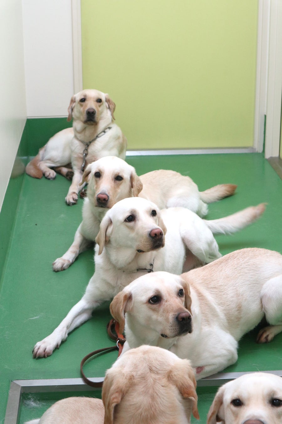 アイメイトになるために訓練中の候補犬約10頭がずらっと廊下に並び、順番を待ちます。