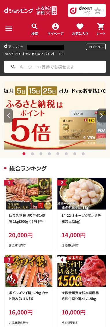 株式会社オールアバウトライフマーケティング(本社:東京都渋谷区、代表取締役社長:土門 裕之)は、株式会社NTTドコモ(本社:東京都千代田区、代表取締役社長:井伊 基之、以下 「NTTドコモ」)と共同運営する総合通販サイト「dショッピング」(https://dshopping.docomo.ne.jp/)内で運営しているふるさと納税ポータルサイト『dショッピング ふるさと納税百選』(https://dshopping-furusato.docomo.ne.jp/)にて、2023年4月1日0:00よりdカード決済した場合、dショッピング ふるさと納税百選のご利用による進呈ポイント数が常時通常の合計5倍(通常ポイント1倍、dカード決済+特約店ポイント4倍)進呈となります。