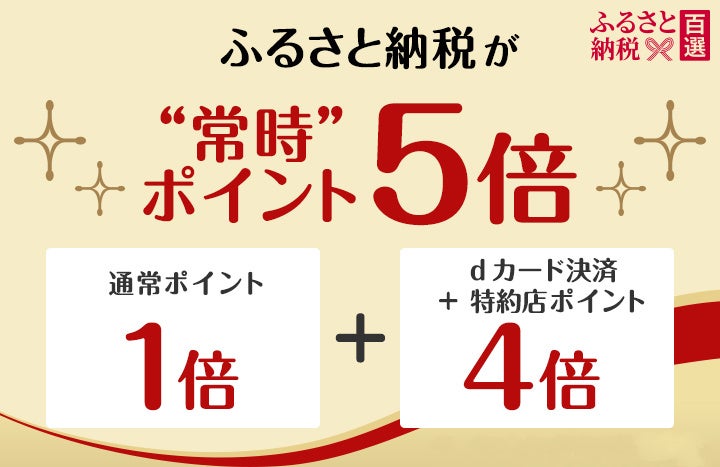 『dショッピング ふるさと納税百選』では、これまでdカードにて決済いただいたお客様には常時3倍のdポイント(通常ポイント1倍、dカード決済+特約店ポイント2倍)を進呈しておりましたが、dカード決済+特約店ポイントが4倍に、ポイント進呈数がアップします。