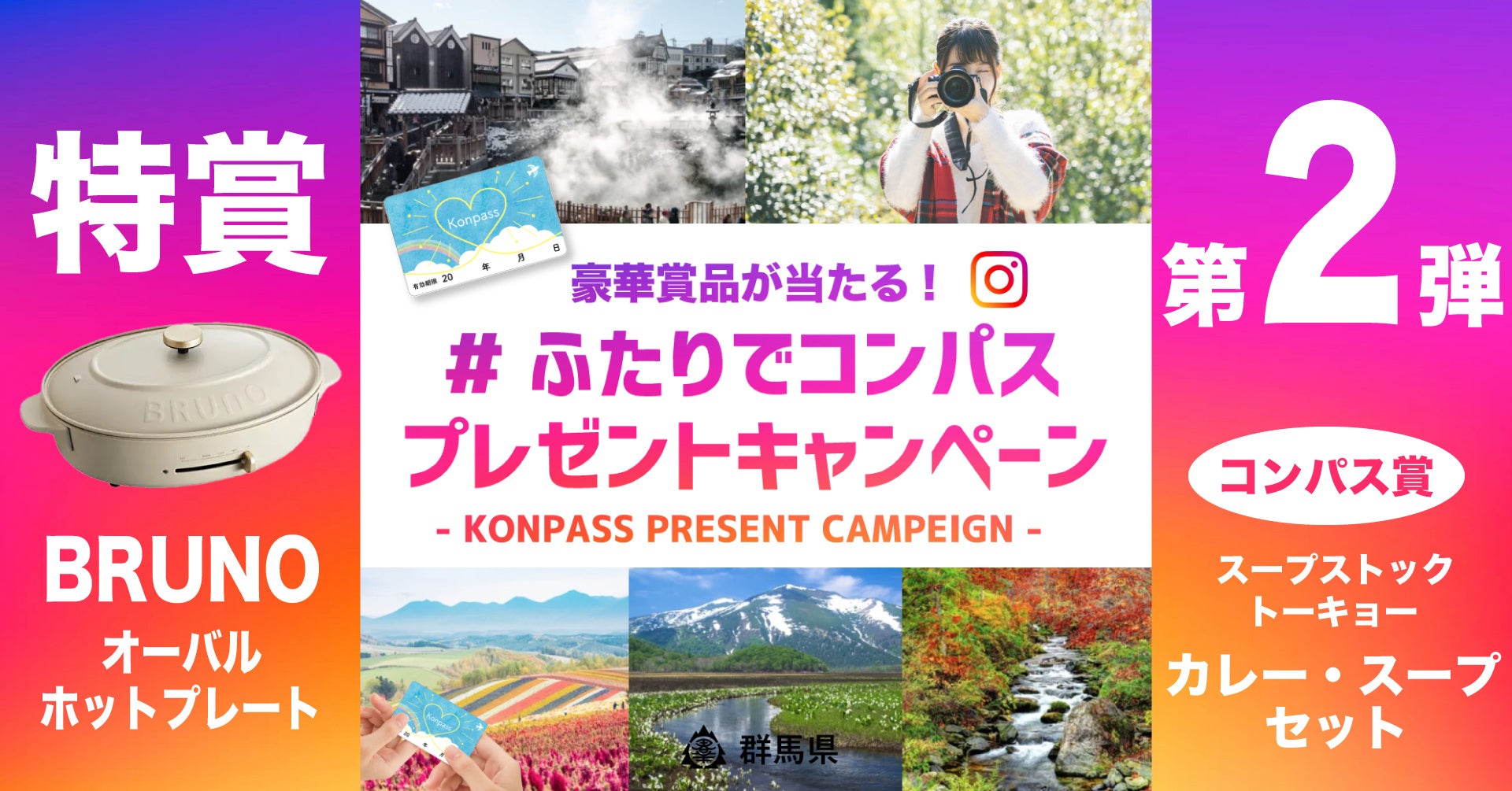 Instagram のキャンペーンアカウントをフォローして、「#ふたりでコンパス」をつけてステキな群馬県内のスポットを投稿すると豪華賞品が当たるかも?!