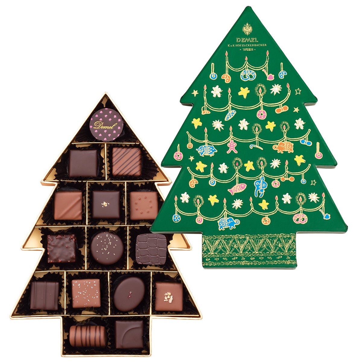 商品特長:クリスマスツリーをかたどったパッケージに、クリスマス限定シャンパントリュフを含む9粒/15粒を詰め合わせました。