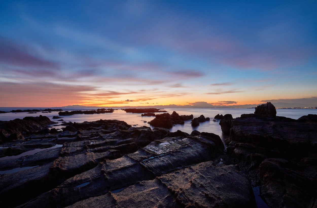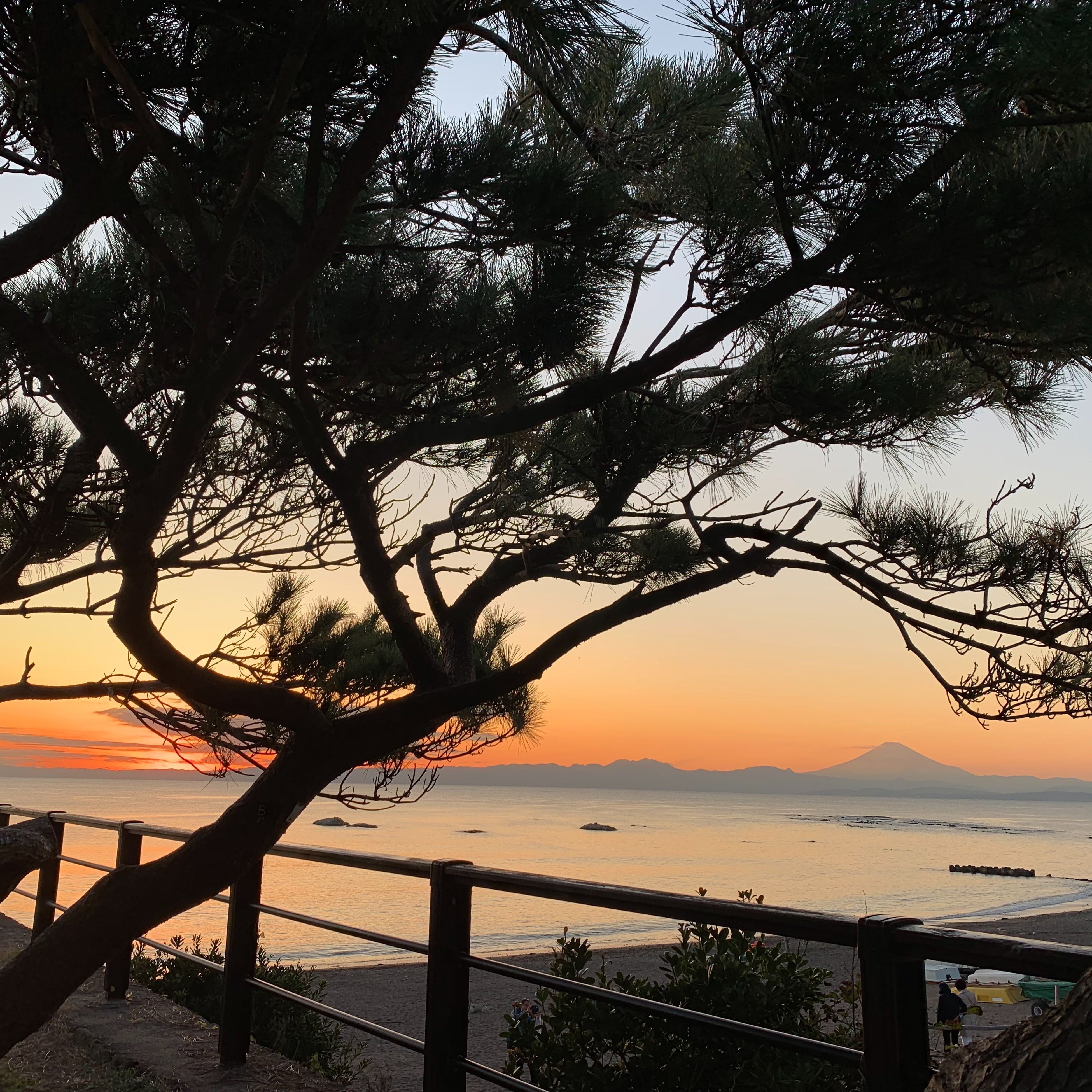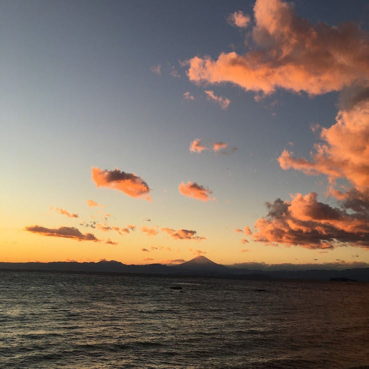 海へ出て穏やかな風と波音に耳を傾ける、遠くには富士が浮かび、空はオレンジ色に染まっていく。