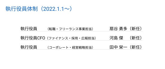 ファインディ株式会社(本社:東京都品川区、代表取締役:山田裕一朗 以下「当社」)は、2022年1月1日付けにて新任執行役員として扇谷勇多、河島傑、田中栄一の3名が就任したことをお知らせいたします。