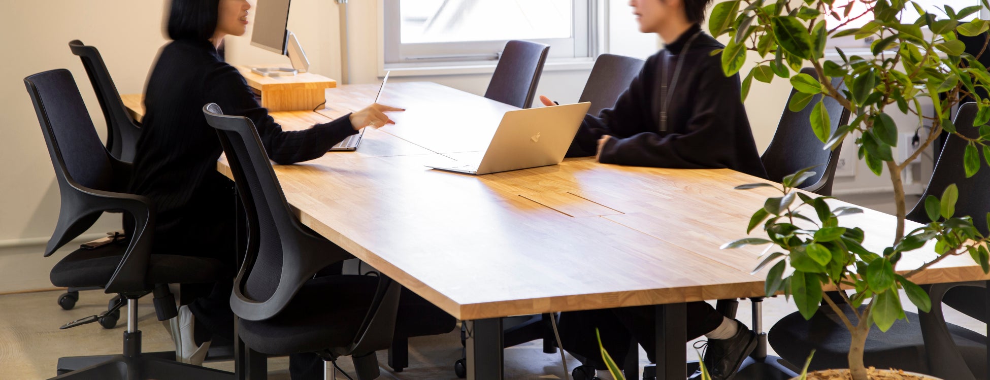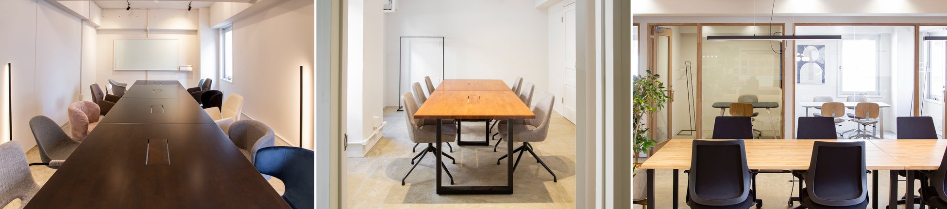 新オフィスにはKANADEMONOのプロダクトを全面的に取り入れ、従業員が実際に使いながら働く様子を見ることができます。オンラインストアだけでは確認できない家具の組み合わせや空間に対するサイズ感、色味などを確認いただけます。大中小の会議室から執務空間まで、それぞれの空間にぴったりなサイズのテーブルを設置し、当社の強みであるサイズオーダーが生む「ちょうど良さ」を体感できます。