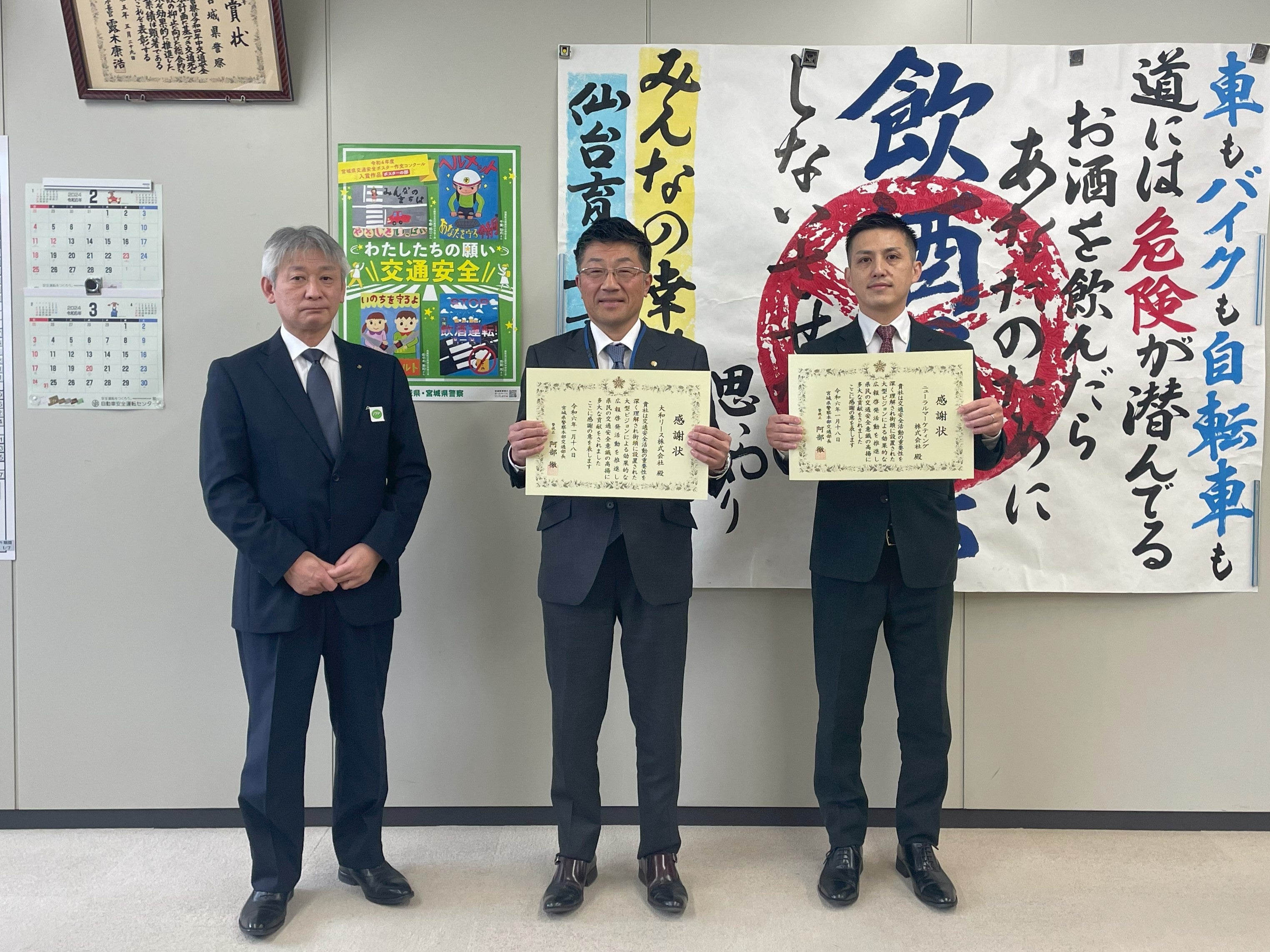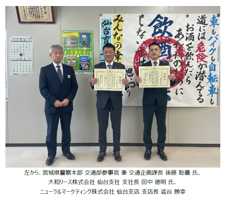 仙台駅前の大型LEDビジョンにおける交通安全の啓発活動に対し、宮城県警察本部交通部長より感謝状を受領