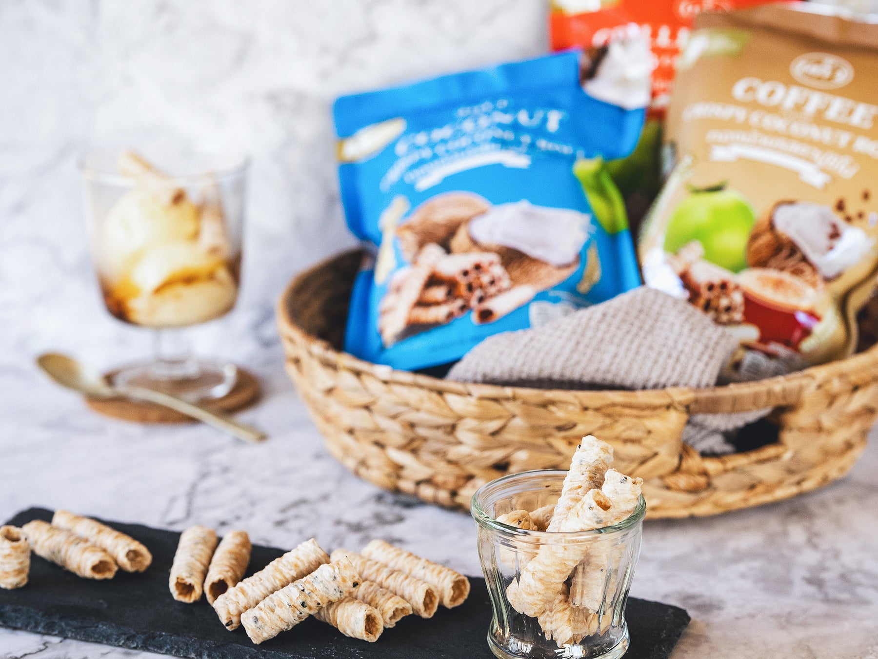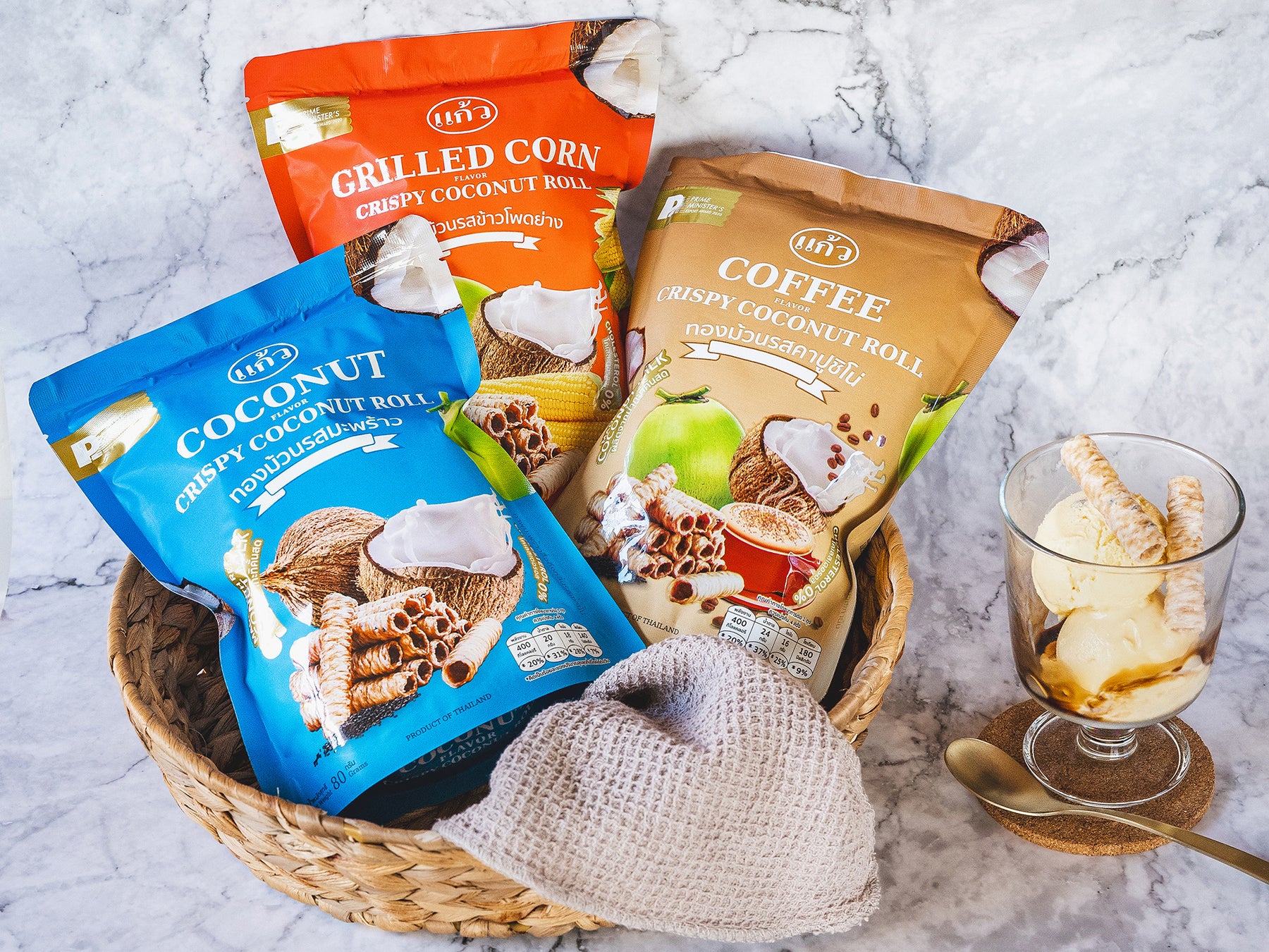 タイ発ローカルスナックブランド〈ゲーオ(Kaew)〉のクリスピーココナッツロールは搾りたてのココナッツミルクを使用し、ロール状に巻いたサクサクのココナッツスナック。ココナッツが苦手な方でも誰もが口をそろえて「とにかく美味しい」と言うこの驚きの美味しさは、鮮度が命のココナッツを独自のステップで製造管理しているから。