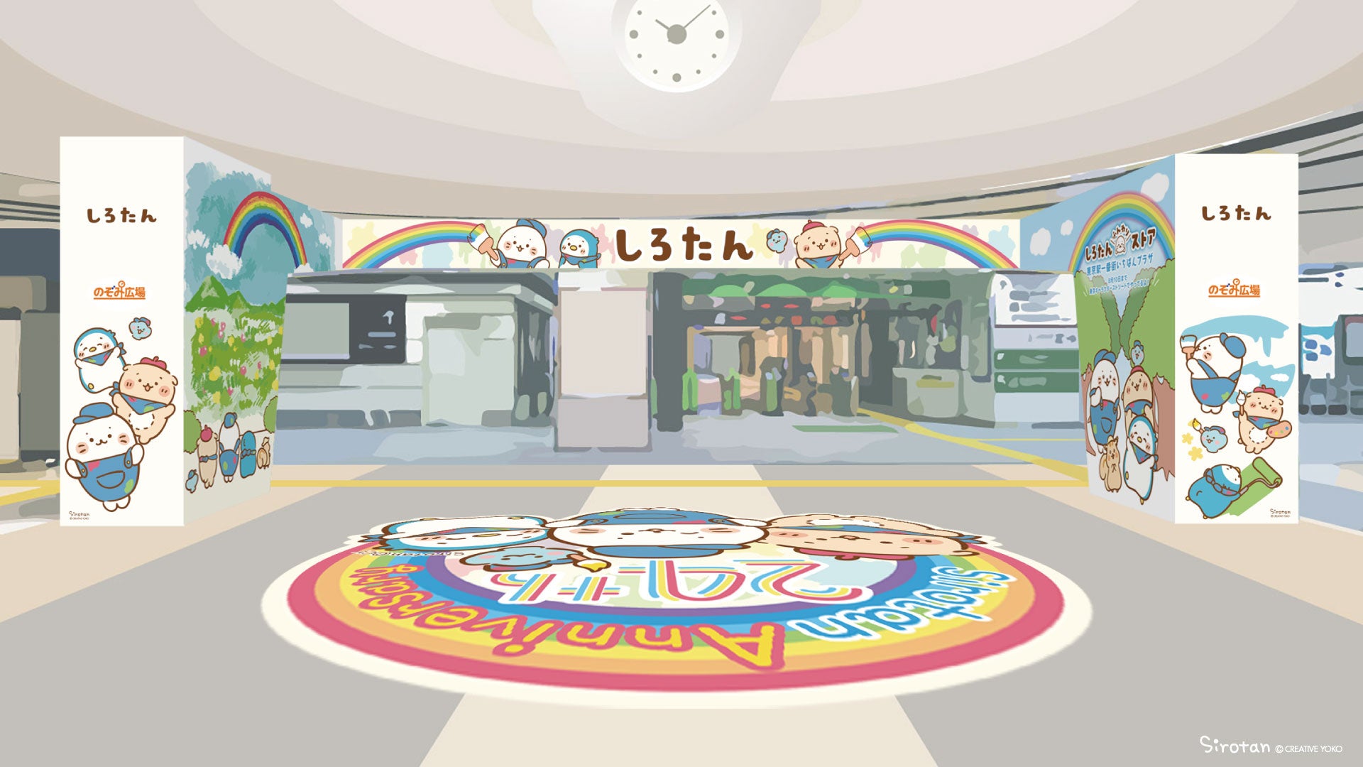 「しろたんふんわりストア」オープン期間中の8月8日(火)は、『しろたん』の誕生日で、一般社団法人日本記念日協会より「しろたんの日」としても認定されています。今年24周年を迎えるしろたんのアニバーサリーのテーマは、語呂合わせで“虹[24]”。この度のポップアップストアでは、東京駅八重洲地下中央改札前“のぞみ広場”から“東京キャラクターストリート”一帯を、雨上がりの青空にかかるきれいな“虹”のイラストでラッピングします。キャラクターストリートの雰囲気と『しろたん』の世界が融合し、思わず微笑んでしまう癒しの空間を提供します。