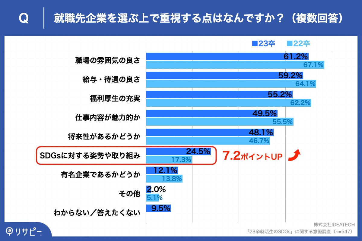 - 就職先の選社軸、「SDGsに対する姿勢や取り組み」は24.5%(22卒比+7.2ポイント)