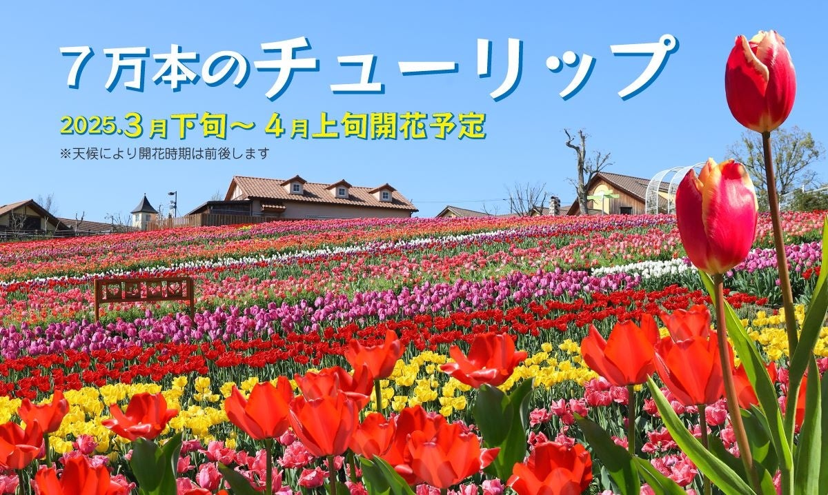6色・7万本のチューリップが咲く花畑。まるで絵本の世界に迷い込んだかのような非日常感を味わえる春のイチオシスポットです。