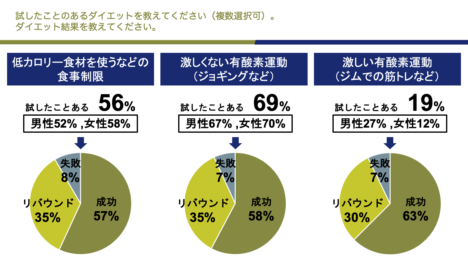 ・低カロリー食材を使うなどの食事制限:成功した95/成功したがリバウンドした58/失敗した14