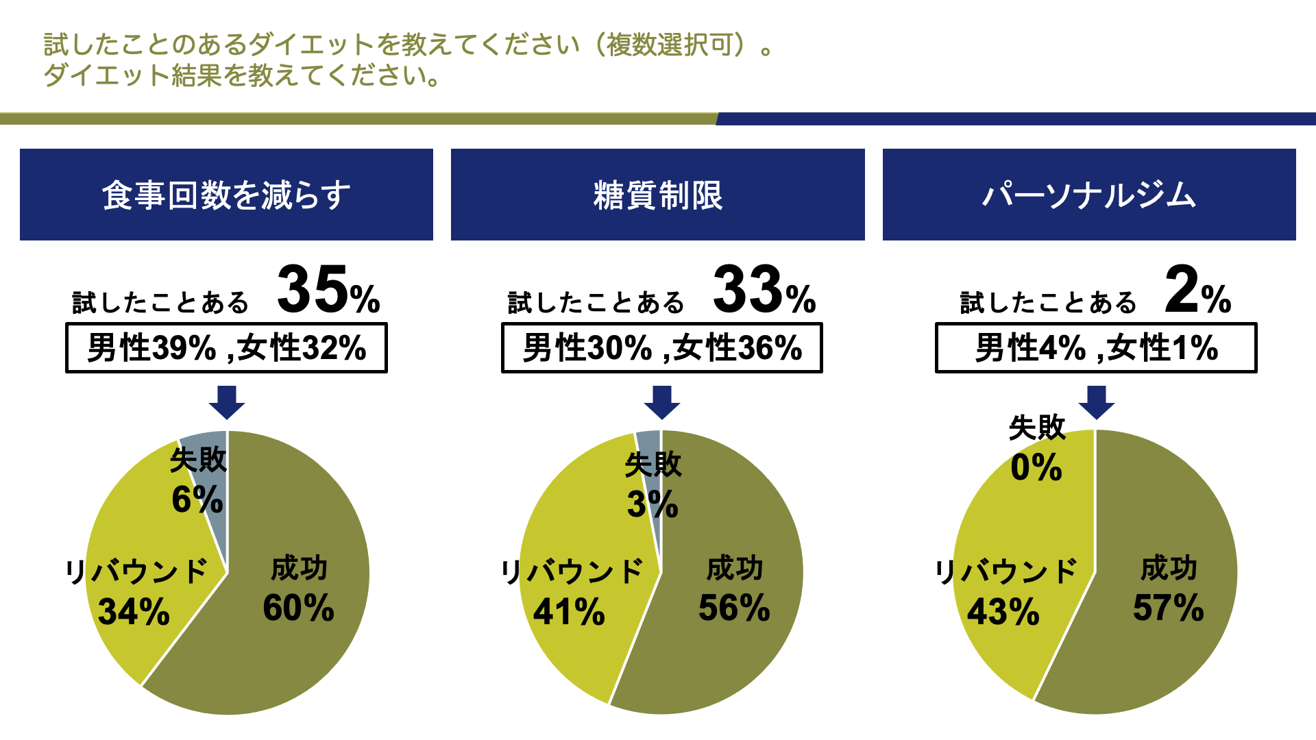 ・食事の回数を減らす:成功した64/成功したがリバウンドした36/失敗した6・糖質制限:成功した56/成功したがリバウンドした41/失敗した3
