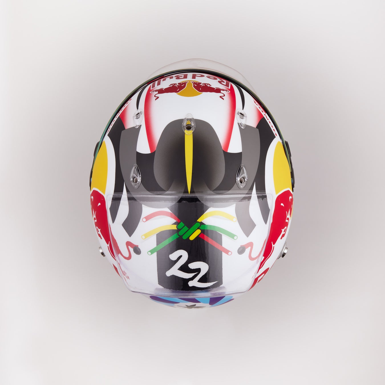 角田選手にとって、母国開催かつ、F1トップチームでの新たな挑戦がスタートする今回の日本グランプリ。そんな特別な一戦で使用するヘルメットは、日本の伝統文化「歌舞伎」をコンセプトにしたデザインになっています。デザインを監修したのは、歌舞伎役者でF1日本GPの公式アンバサダーを務める市川團十郎さん。市川團十郎家に代々伝わる家の芸、歌舞伎十八番の内『暫(しばらく)』をモチーフに、隈取や仁王襷をあしらったデザインとなっており、後頭部には市川團十郎直筆のカーナンバー「22」が描かれています。