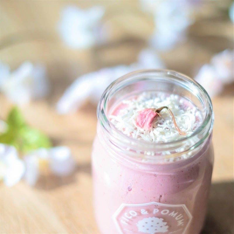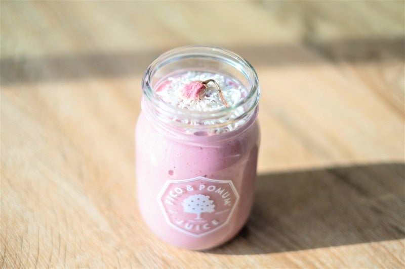 フィコ&ポムムでは、2018年から3月~4月の期間限定で「さくらスムージー」を販売しています。春だけの限定商品として、発売以来多くのお客様に愛されています。甘酸っぱいストロベリーとアメリカンチェリーを組み合わせた淡いピンク色のスムージーに、ほんのり塩味の効いた生のさくらの葉、サクサク食感で風味の良いドライココナッツをたっぷりかけて仕上げています。ジューシーな甘さが広がり、さっぱりした口当たりで飲みやすく、さくらフレーバーの華やかな香りに包まれて気分が高まる贅沢なスムージーです。また、お好みでスムージーにプラスするブースターオプション(74円~※)も23種類ご用意している他、価格や使用材料はそのままに「RICH」または「LIGHT」の2種類の質感でご提供いたします。「RICH」は、贅沢で濃厚な質感。「LIGHT」は、冷たすぎず、なめらかでやさしい質感。自由にアレンジを加えて、「さくらスムージー」をお楽しみください。
