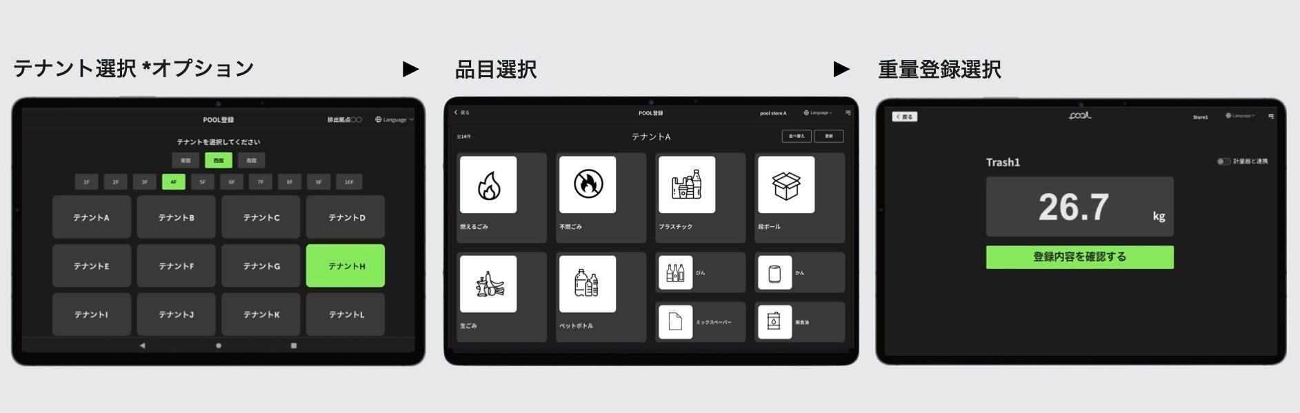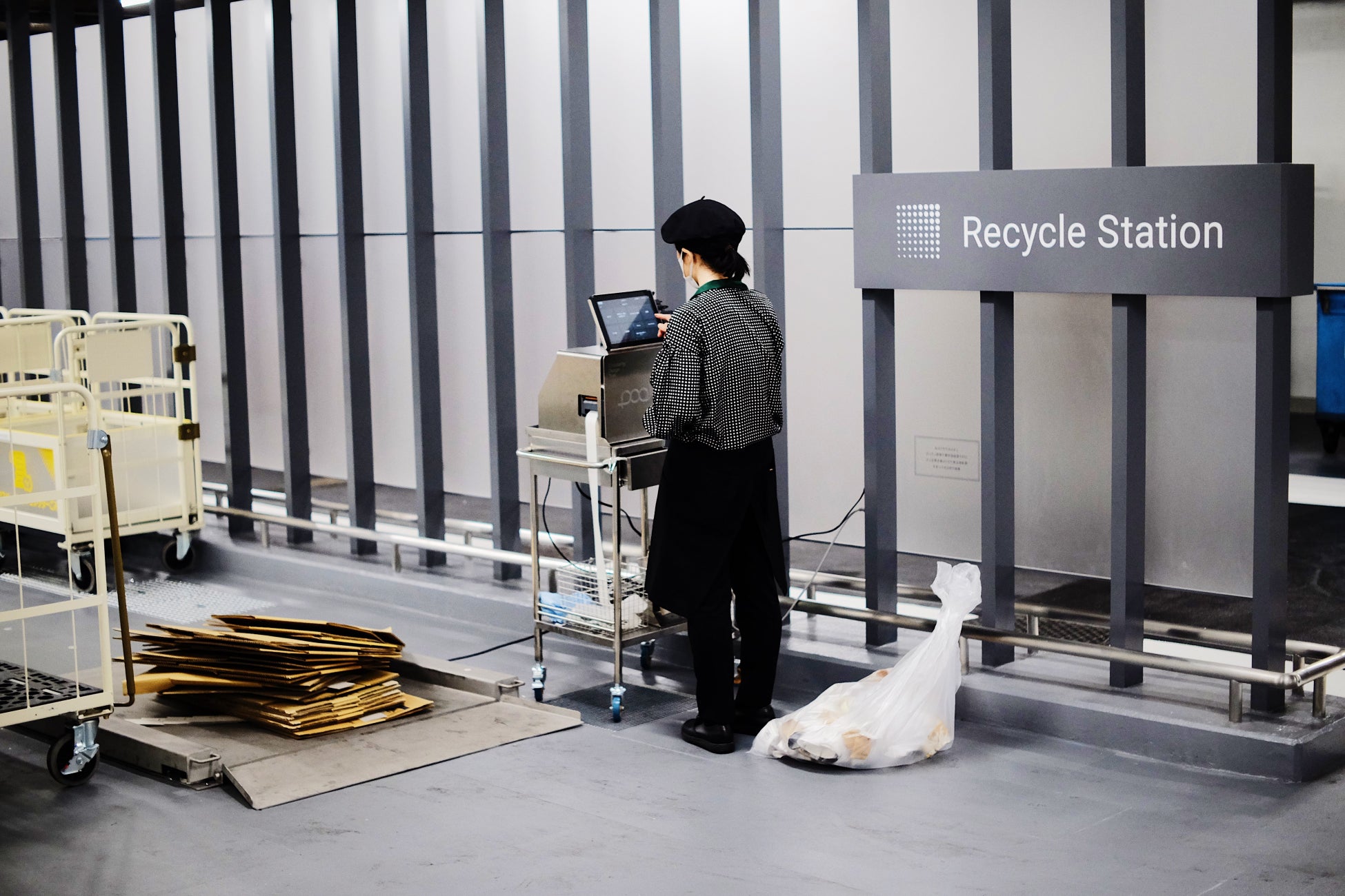 「シンプルさ」を追求した pool のユーザーインターフェースは、廃棄物管理の常識を覆します。タッチパネルには必要最小限の情報だけを表示し、画面の指示に従って操作するだけで、誰でも迷わず廃棄物の登録ができます。さらに計量器との自動連携により、手入力による計量ミスも解消されました。ICカードをかざすことでテナントが識別され、発行されるラベルを貼り付けて、正確な重量管理と排出者の特定が瞬時に完了します。