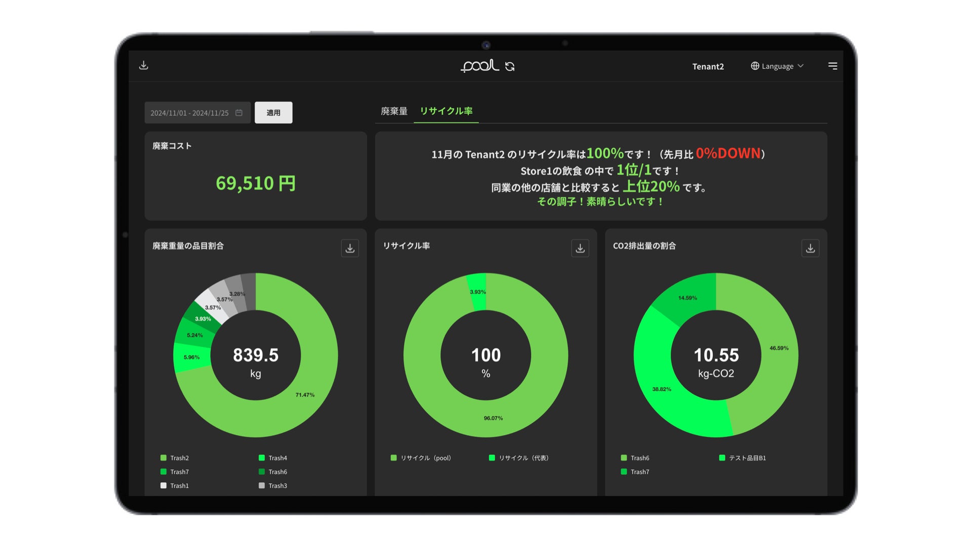 さらに、pool は各テナント専用のダッシュボードを通じて、リアルタイムな排出状況の確認を可能にしました。前月比での廃棄量の増減や、同業種内でのリサイクル率ランキングをわかりやすく伝えることにより、環境意識の向上に繋げます。特に、業態別のリサイクル率ランキングは、テナント間で健全な競争意識を生み出し、自主的な廃棄物削減とリサイクル率向上への強い動機付けとなっています。この「見える化」と「ゲーミフィケーション」の組み合わせにより、施設全体の環境パフォーマンスが向上する仕組みを提供します。