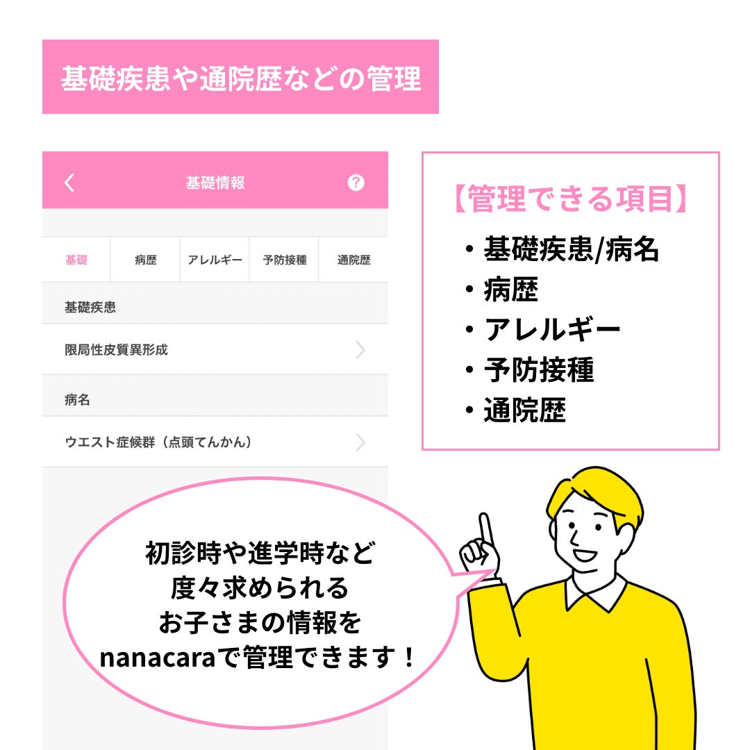 今回のnanacaraアプリのアップデートに合わせて、医師の先生方が使う「nanacara for Doctor」の機能も追加しています。医師の先生方は診療後の経過観察、発作記録の他、基礎疾患、予防接種、アレルギーなどの情報と併せてひと目で把握できるようになりました。診療の効率化が期待されると共に、診察時間を患者・ご家族とのより質の高いコミュニケーションに充てることが可能となります。
