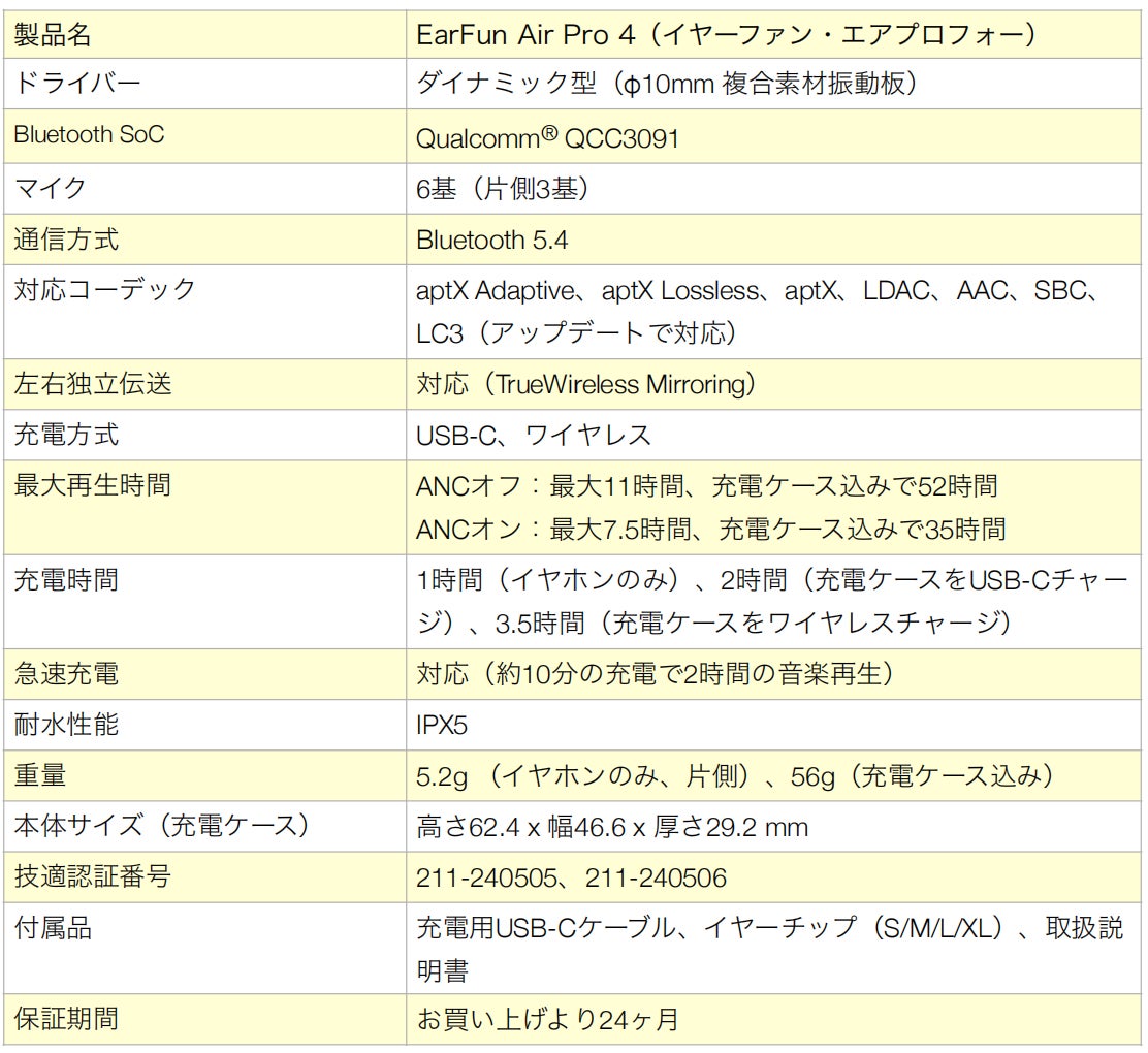 50dB低減の強力ANCとハイレゾ対応の完全ワイヤレスイヤホン「EarFun Air Pro 4」発売
