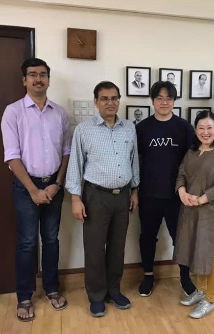 | 2020年2月 インド工科大学ボンベイ校にて。左から: Biblab Banerjee 助教授 (当社技術顧問)、学長のSubhasis Chaudhuri氏、 当社取締役CTO 土田 安紘、最高人事責任者 土田 美那 |