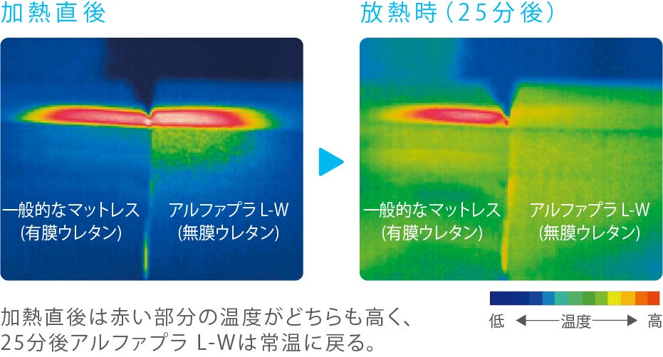 高弾性無膜ウレタンフォームが熱をすばやく放散し、暑さを軽減します。有膜ウレタンフォームマットレスに比べ、熱の放散性能が30%以上向上しています。