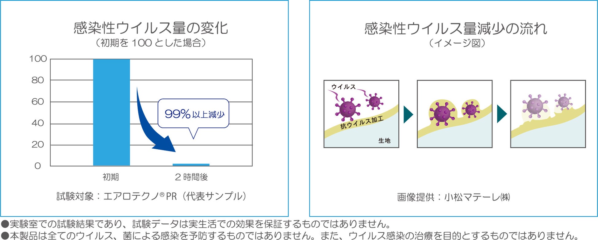 抗ウイルス加工素材「エアロテクノ🄬PR」を使用。抗ウイルスにおいては、2時間で99%以上の感染性ウイルス量の減少を確認しています。