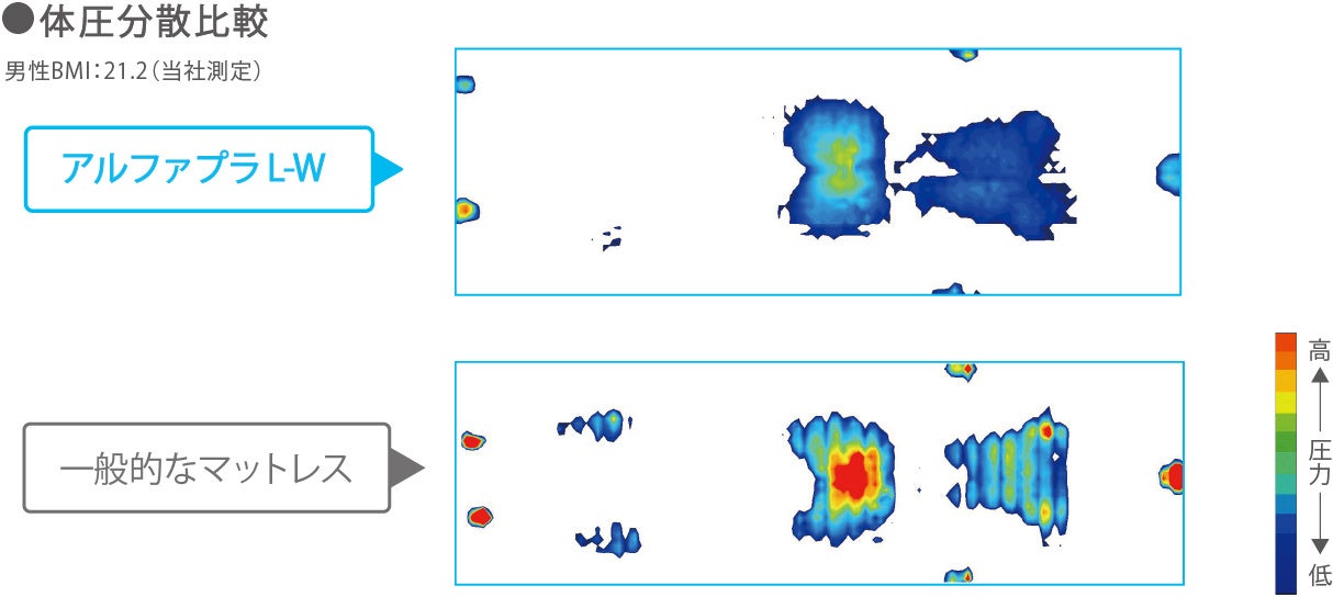 上層と中層に柔らかめの高弾性無膜ウレタンフォームを使用。さらにαGEL(アルファゲル)を組み合わせることにより、床ずれが心配になりはじめた方に適した体圧分散を実現します。