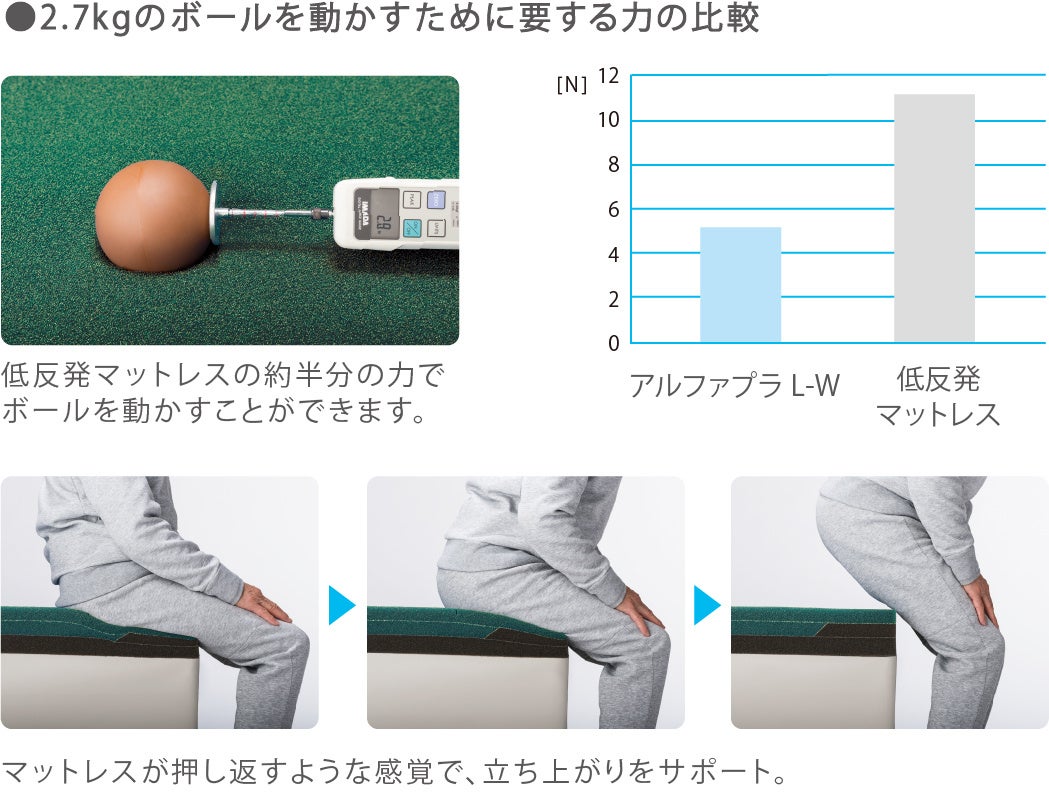 2種類の高弾性無膜ウレタンフォームが3層にバランスよく配され、適度な弾力で身体を押し上げます。これにより、寝返り、起き上がり、立ち上がりといった一連の動きがスムーズに行えるようにサポートします。