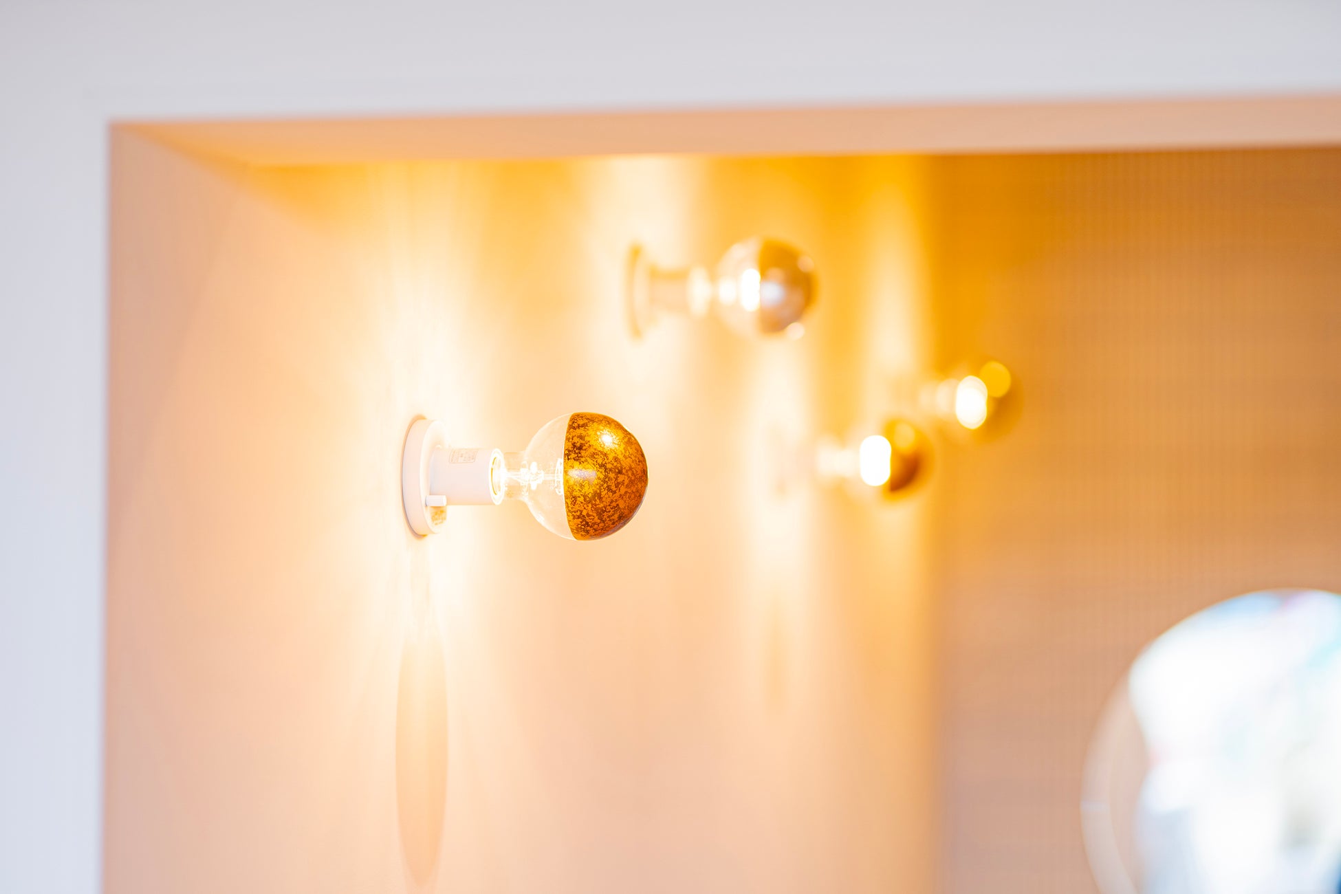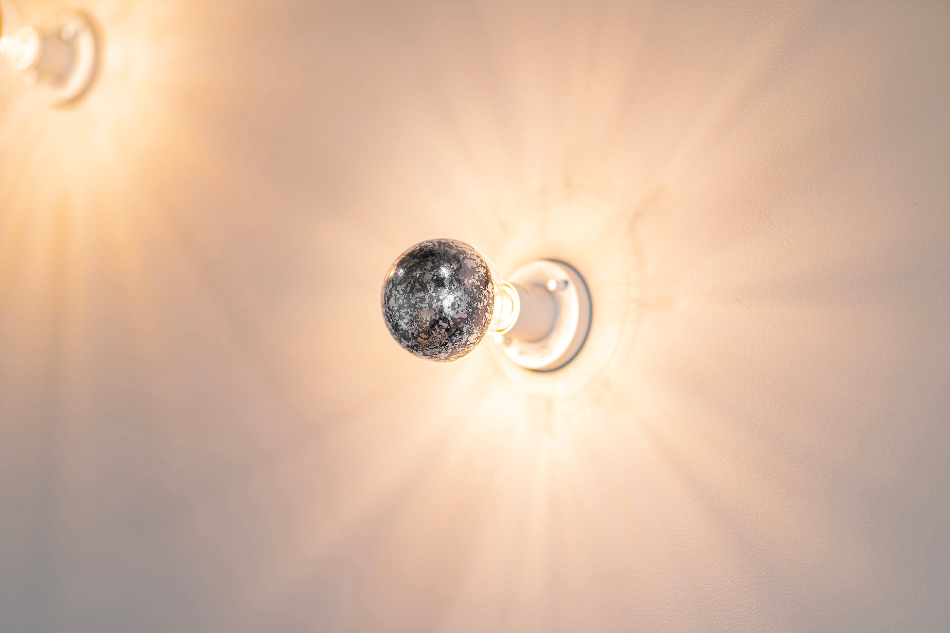 光を電球内で反射させることで壁面を光で飾るライト。漆芸技術を用いたランダムなテクスチャーが映える、金箔・銀箔・白檀の3種類。