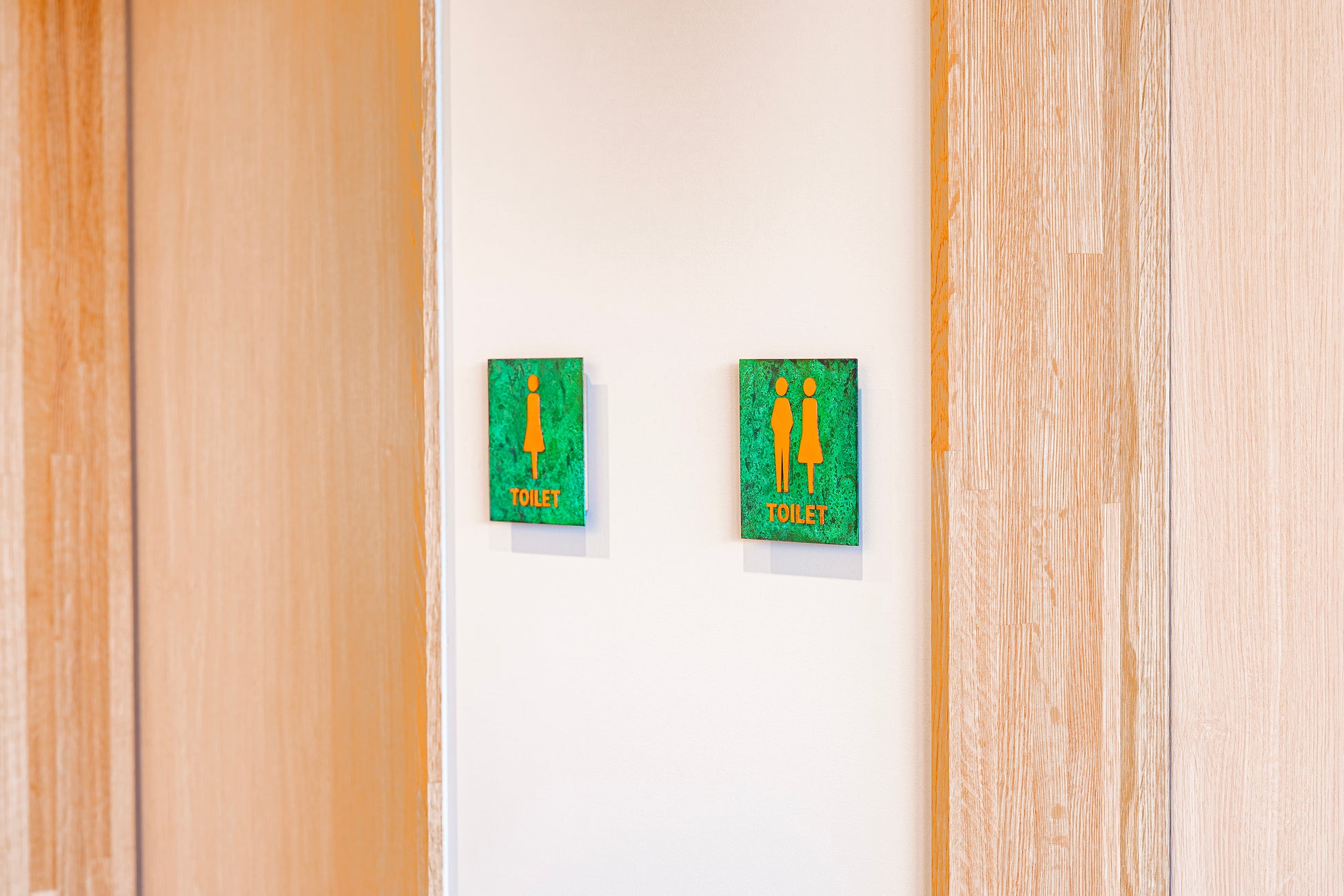 お手洗いのドアハンドルも高岡の鋳物技術で制作しています。あえて磨きをかけずに鋳造時の表情を残した「鋳肌」の質感と経年変化をお楽しみ下さい。