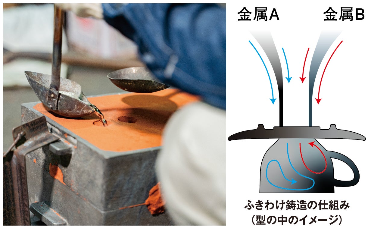 接合したわけでも、調合しわわけでもない、異なる金属が型の中で混ざることでできる「ふきわけ鋳造」。溶け流れた型の中で、縦真っ二つで分かれることも、上下に分かれることもある、この技法を得意とする「般若鋳造所」にる、完全にアンコントロールな、偶然を楽しむ鋳造方法です。