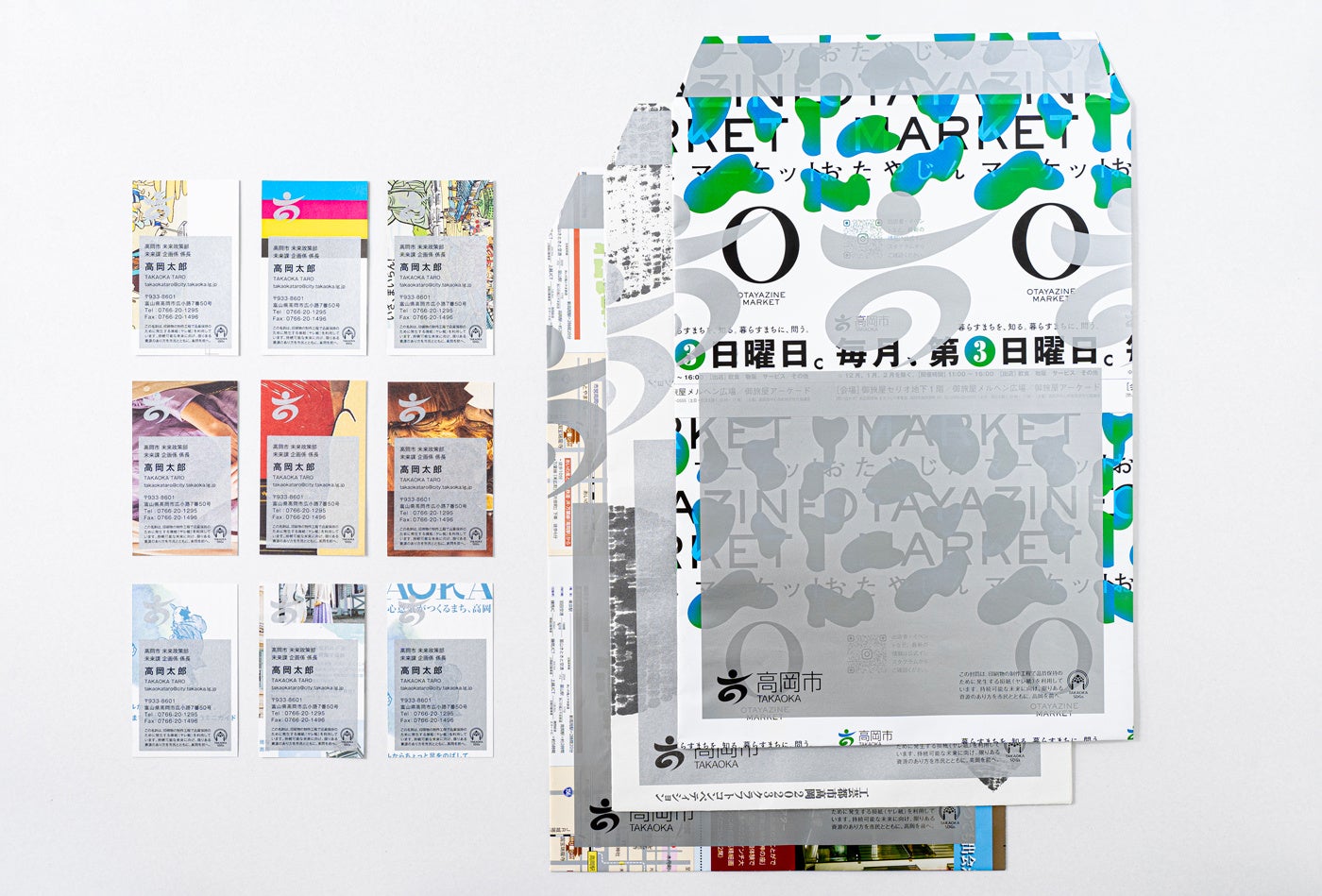 印刷業者の製造工程の中で必ず発生する品質調整のための試し刷り用損紙(通称ヤレ紙)を利活用しました。独自のサスティナブルな社会モデルに取り組む高岡市と共同し、『高岡市役所が発行する広報物の印刷時に発生したヤレ紙を使って、高岡市の職員名刺および封筒に作り替える』プロジェクトを2023年よりスタートしました。再生紙という従来のリサイクルではなく、上書きでこれまでの印刷物としての気配を残すという方法があたらしいアプロートとして、各種メディアに取り上げていただきました。