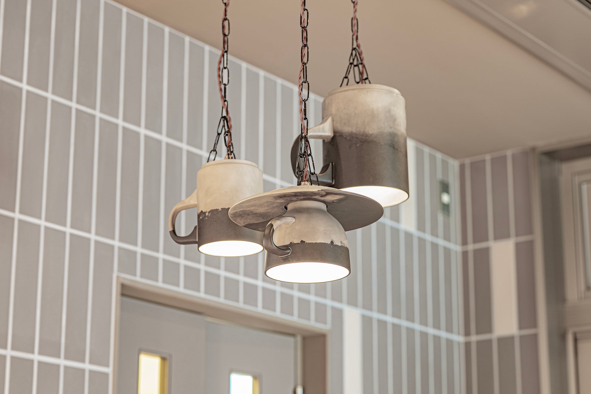 異なる2種の金属を同時に型へ流し込む「ふきわけ鋳造(ちゅうぞう)」技術を用いたペンダントライト。タリーズコーヒーのマグカップをモデルに3種作りました。型の中で曖昧な境界で混ざりあう、偶然出来上がったミルクのような表情は唯一無二の模様です。
