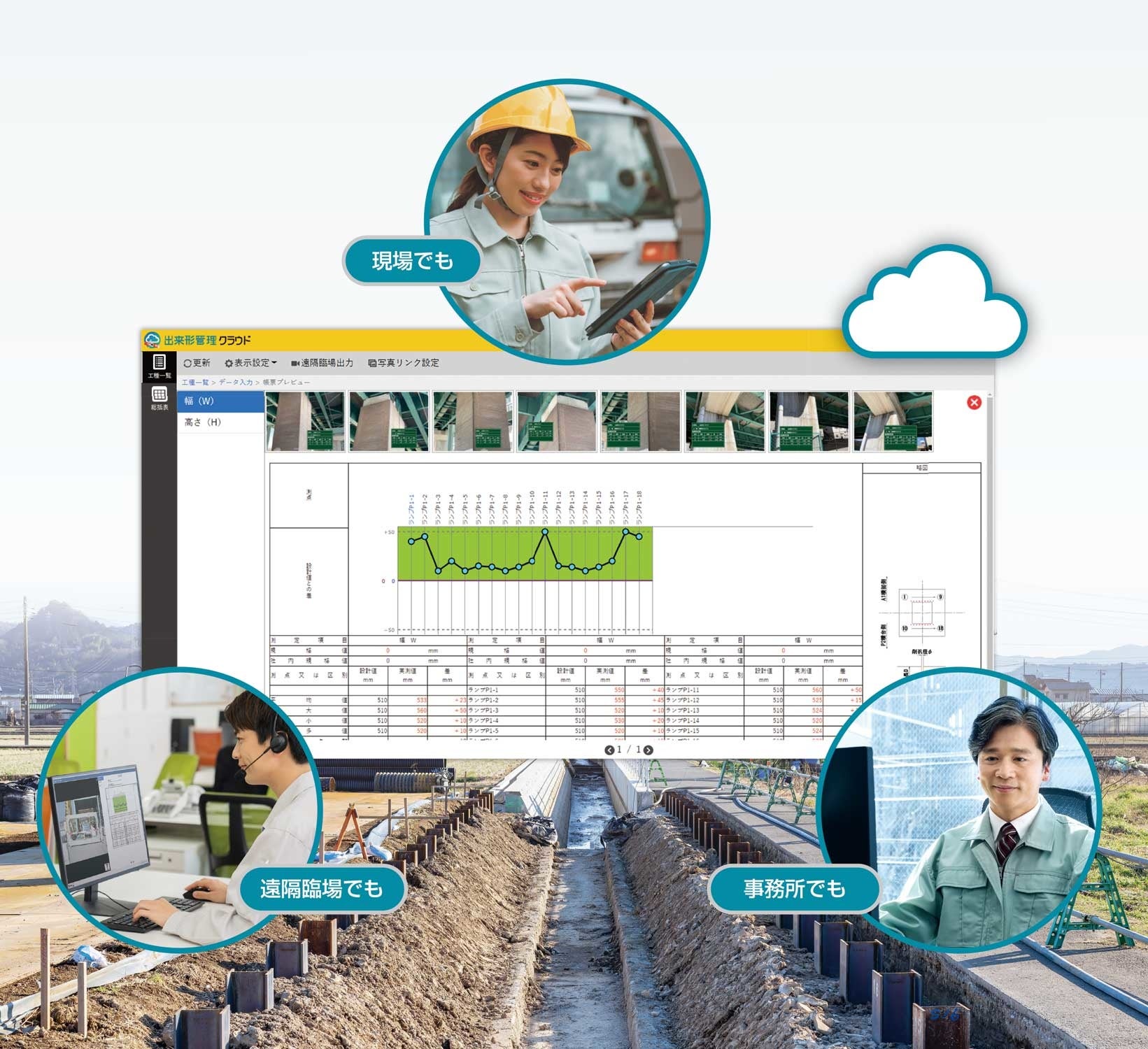 クラウドデキスパート「出来形管理クラウド」は、施工管理値をクラウドで記録し、データをリアルタイムに可視化することで現場把握を容易に行うことができるようになります。また、複数人で同時に稼働できるので、どこからでも場所を問わず編集可能です。