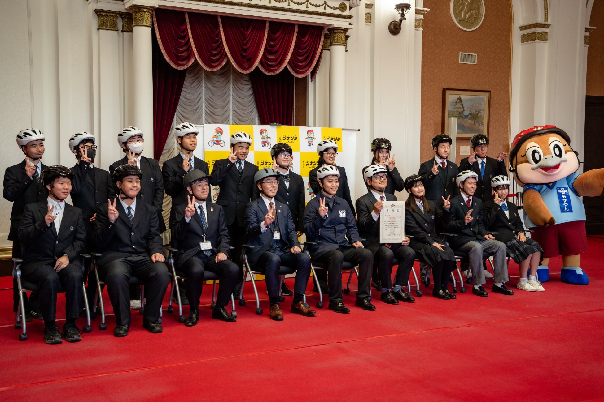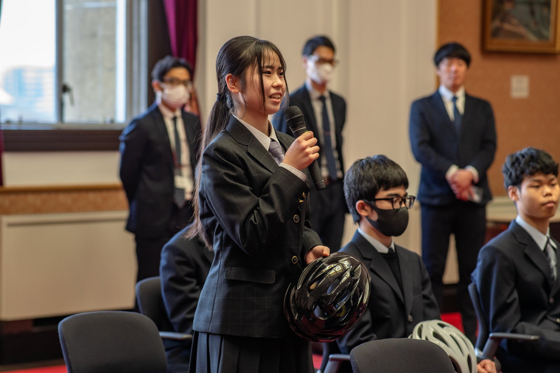 これに対し吉村知事からはお礼の言葉とともに感謝状の贈呈が行われ、「自分は大丈夫だと思っていても事故はいつ起きるかわかりません。自転車に乗るときにヘルメット着用が普通だと思えるように、高校生のみんなと一緒にそんな輪を広げていただけたらと思います」と高校生にメッセージ。