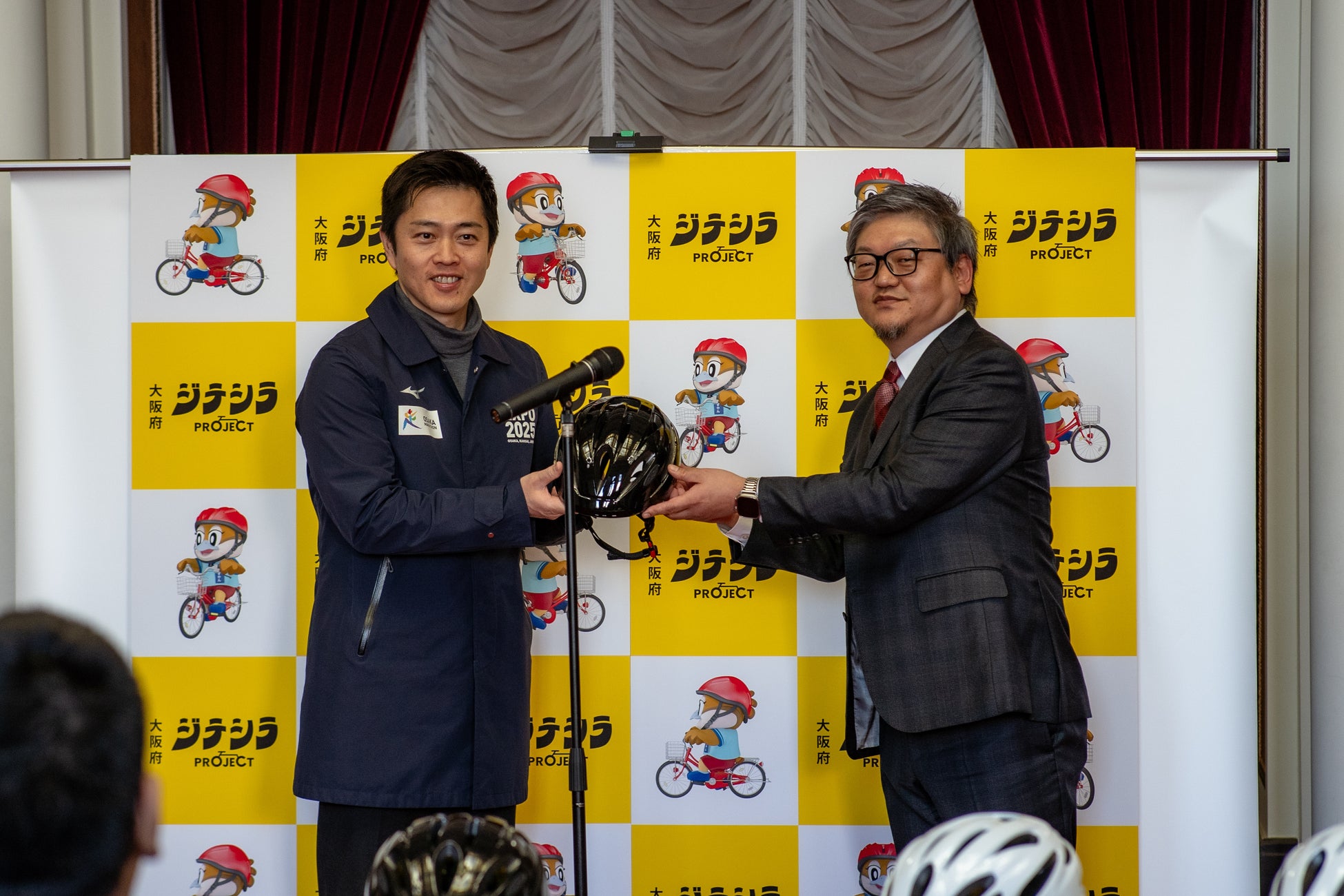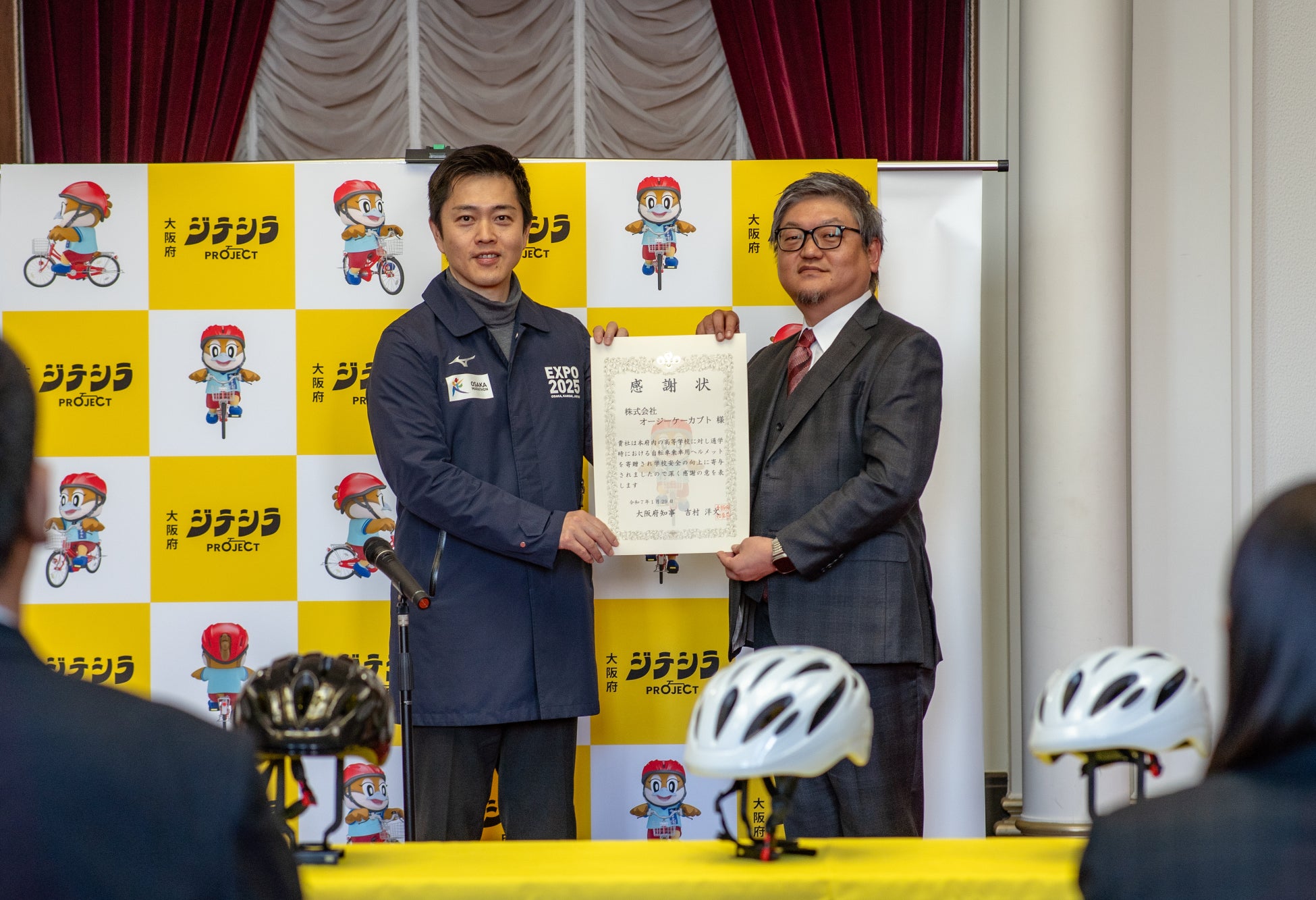 また2024年より大阪府民に自転車の安全利用やヘルメット着用等を啓発する取り組み「ジテシラProject」に協力しています。その一環として、2024年12月、大阪府教育委員会に約2000個の自転車用ヘルメットを寄贈。それをうけて2025年1月29日に府庁本館の正庁の間において、大阪府・吉村洋文知事出席のもと「自転車ヘルメット寄贈式および感謝状贈呈式」が執り行われました。