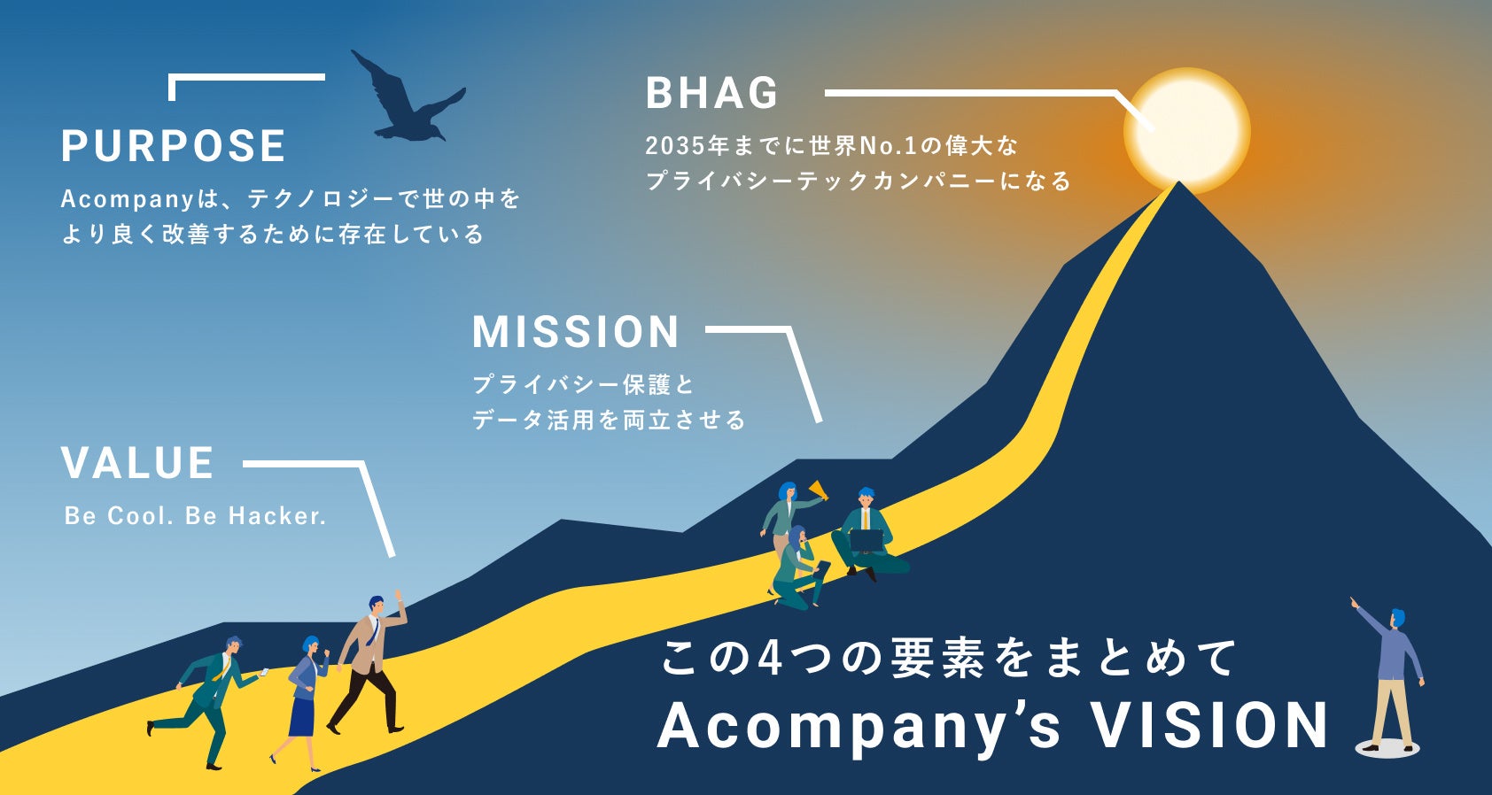 Acompanyでは、2035年までに「世界No.1の偉大なプライバシーテックカンパニー」を目指すため、新たにVALUE、PURPOSE、MISSION、BHAGの4項目を定めました。