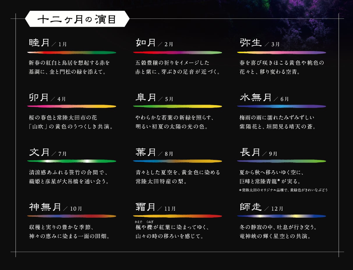 和風月名になぞらえた、各月の風景や常陸太田の自然をモチーフとして取り入れ、月替わりで特色のある演出プログラムを12ヶ月分用意。自動運行プログラムをstuで実装しました。