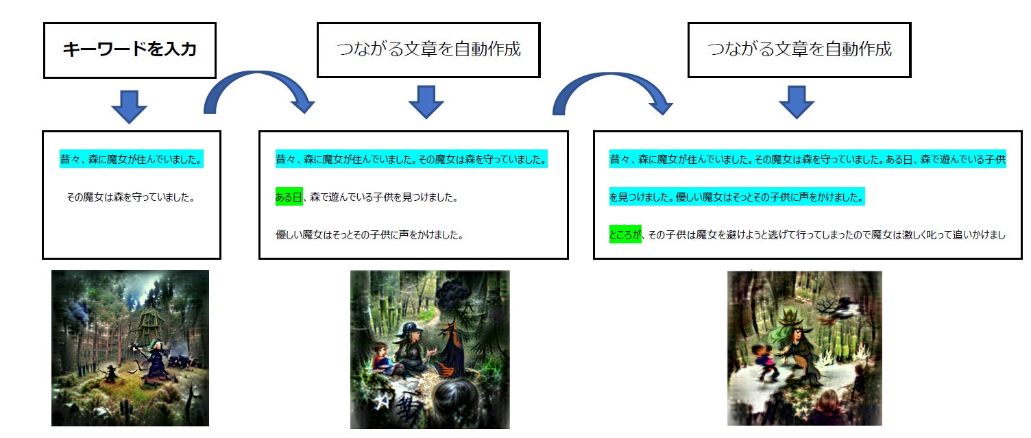 ユーザーとAIが対話的にストーリーを組み上げていくこれまでの先行研究と異なり、本研究はユーザーの負荷を最小限とする「自動生成」を目指しています。今回試作したシステムでは初めにキーワードとなる文章を入力すると、後に続く文章を起承転結の4つのステップで連続生成。さらにそれぞれのステップで文章に合う画像を生成します。AIは絵本全体の構成や情感を理解しません。しかし、文章を生成する段階で起承転結それぞれに冒頭の接続詞を設定することで、自動生成される文章はつながりをもち、絵本として成立することが分かりました。また、画像間が違和感なくつながるように生成するための条件についても明らかにし、絵本として鑑賞し易い画像を作り出すことも可能になりました。