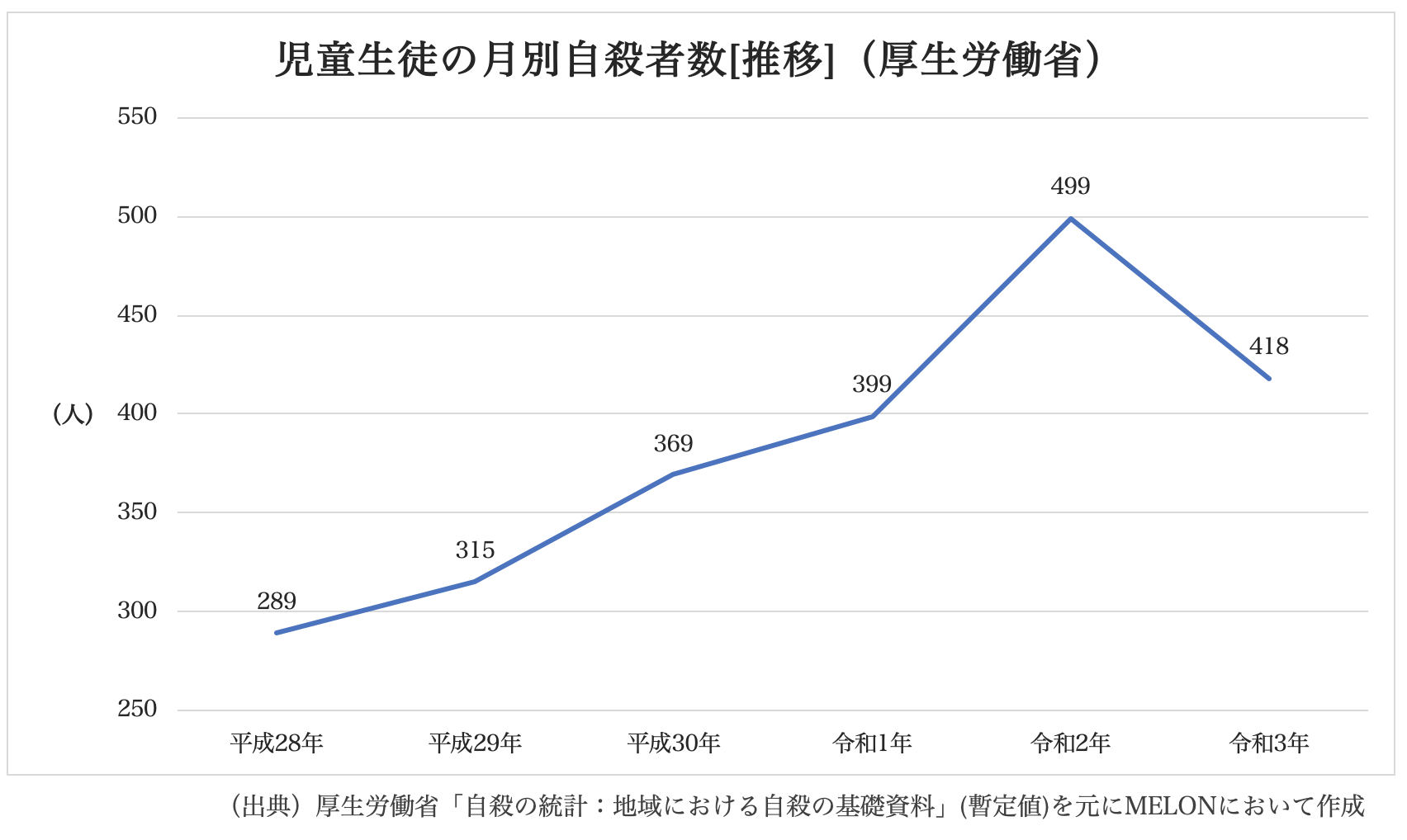 長期に渡るコロナ禍においては、子どもたちへのメンタル面での影響が危惧されており、積極的な心のケアをしていくことが社会的な課題になりつつあります。厚生労働省の調査によると令和3年(2021年)における児童生徒の自殺者数は418人で、過去最多となった令和2年(2020年)からは減少したものの、過去2番目に高い数字となっています。