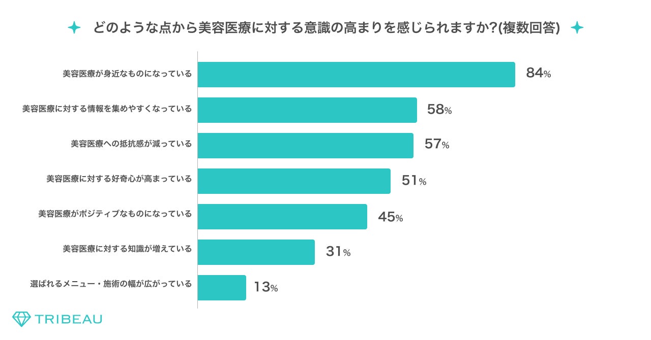 - 84%が美容医療が身近なものになってきていると感じており、また57%が美容医療に対する抵抗感が減っていると感じている。