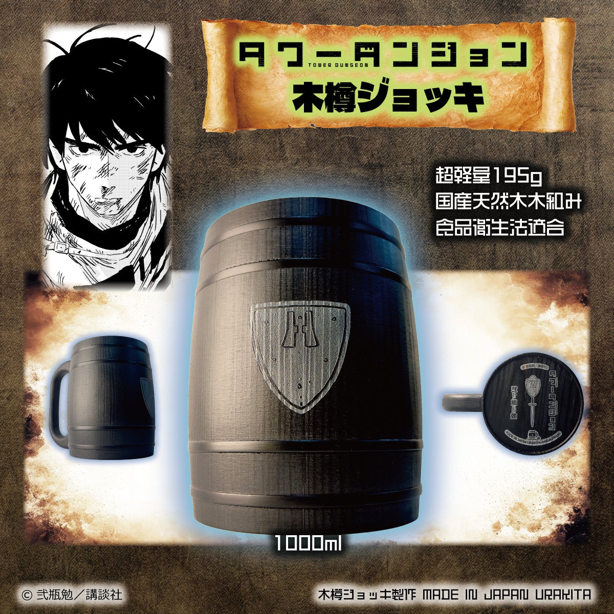 株式会社愛鷹製作所・⼯房名称:URAKITA⼯房(本社:東京都世⽥⾕区、代表取締役:上⽯⼤介)は、月刊少年シリウス連載中『タワーダンジョン』(講談社刊・著者:弐瓶勉)作中に登場する、【盾】【剣】【キャラクター】の彫刻を施した特製『タワーダンジョン』木樽ジョッキを、直販サイト「URAKITA⼯房」にて2025年2月10日(月)12時より新発売します。