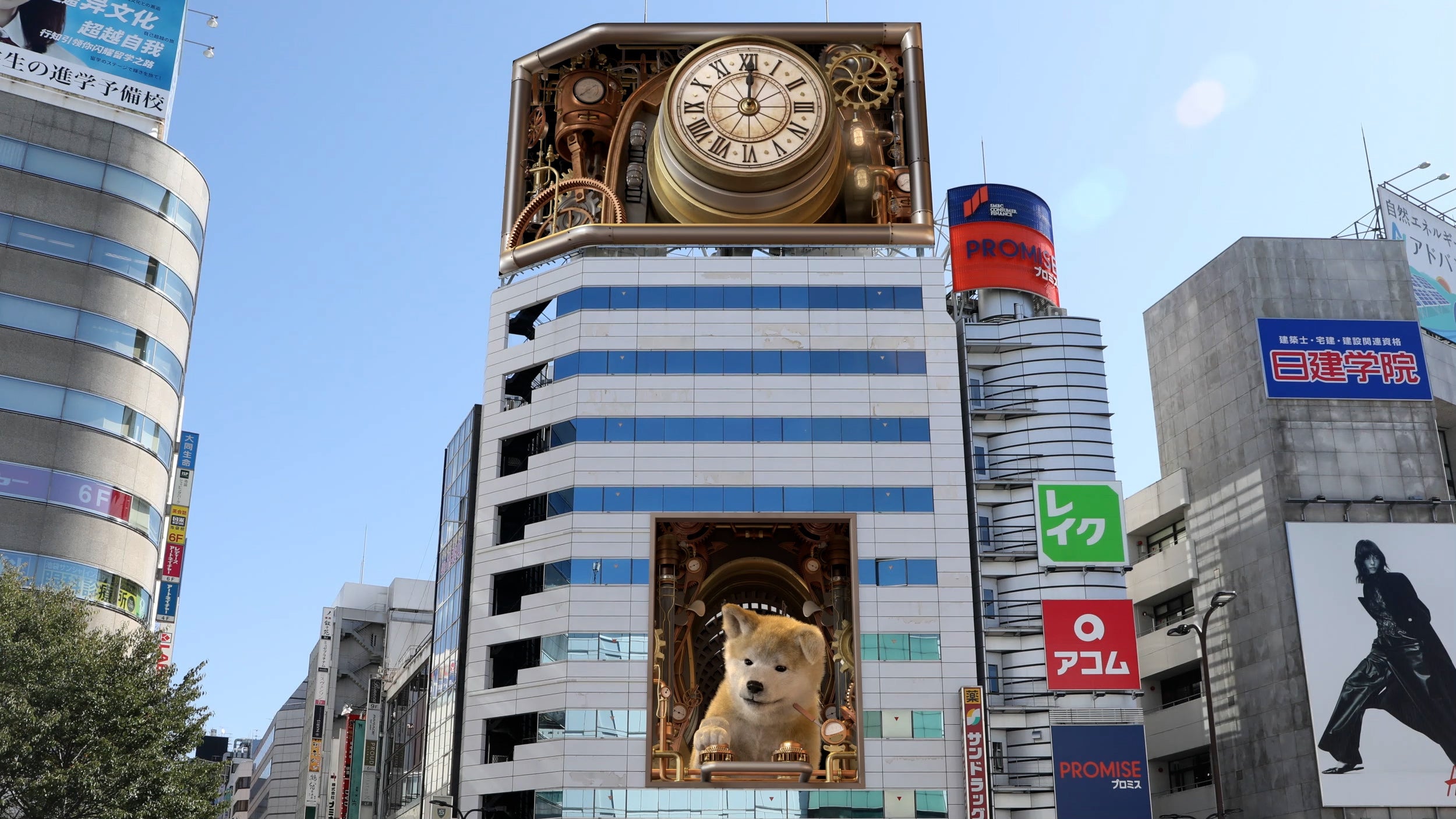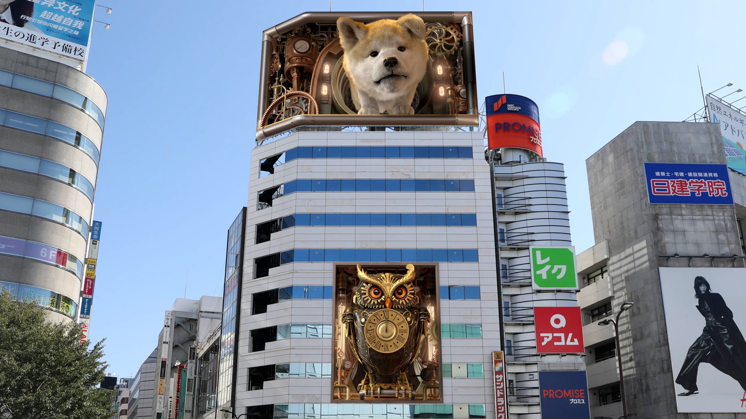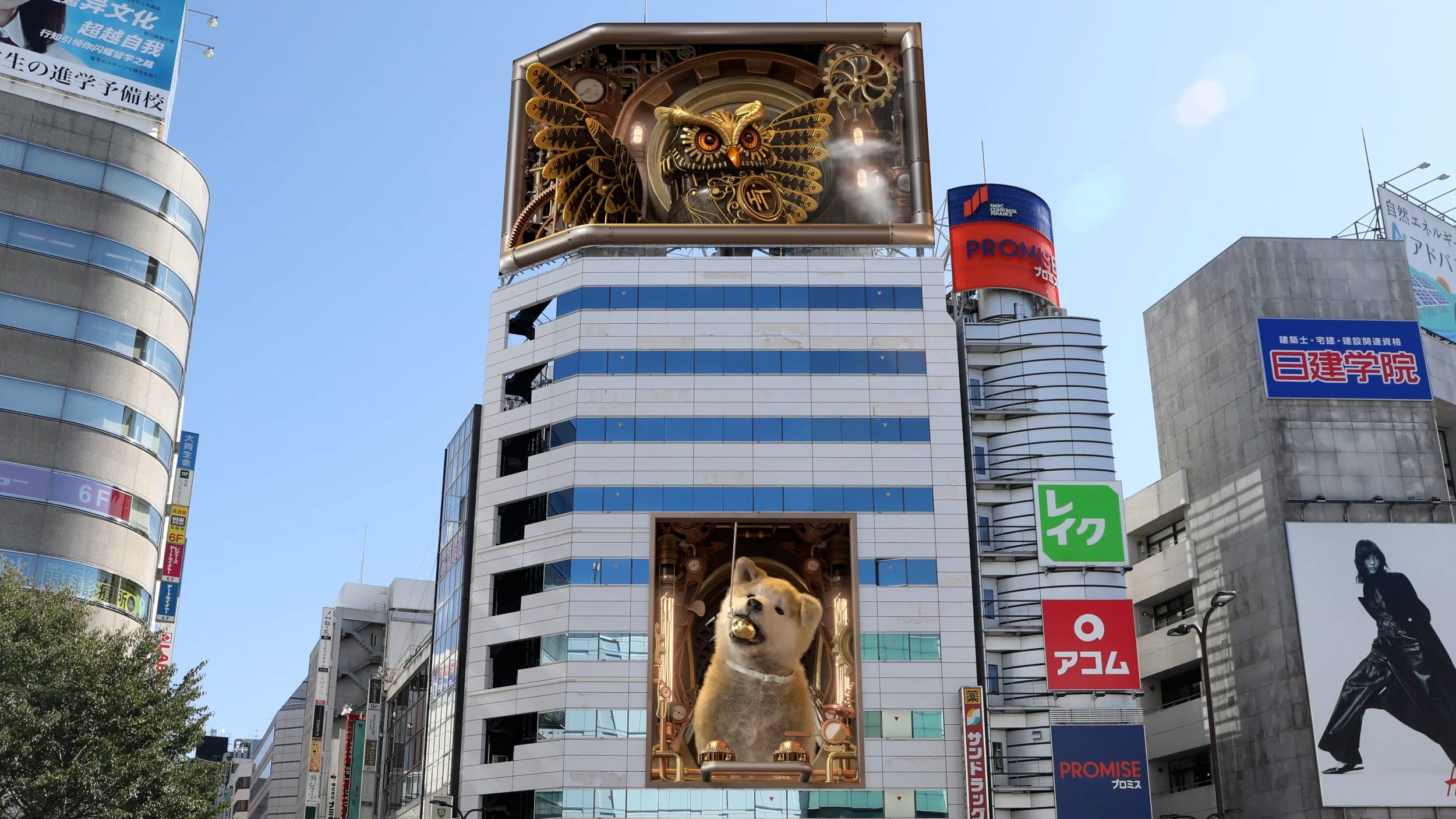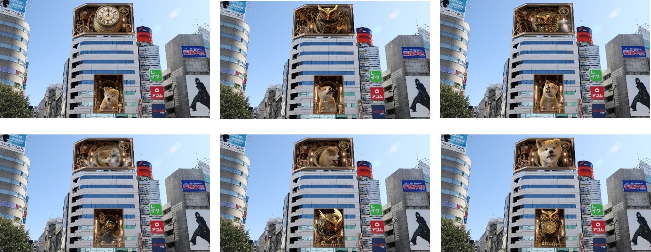 ヒットの屋外デジタルサイネージではおなじみの“肉眼3D動画”では、ヒットの看板犬ともいうべき「秋田犬」だけでなく、池袋の街のシンボルである「フクロウ」も登場する『巨大3Dカラクリ時計』を放映!