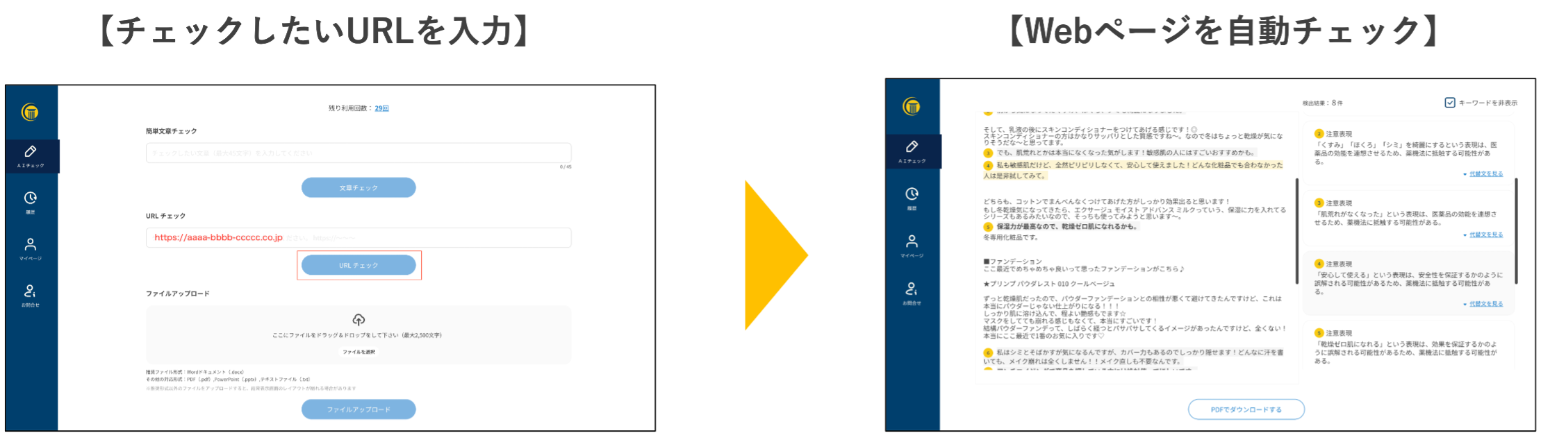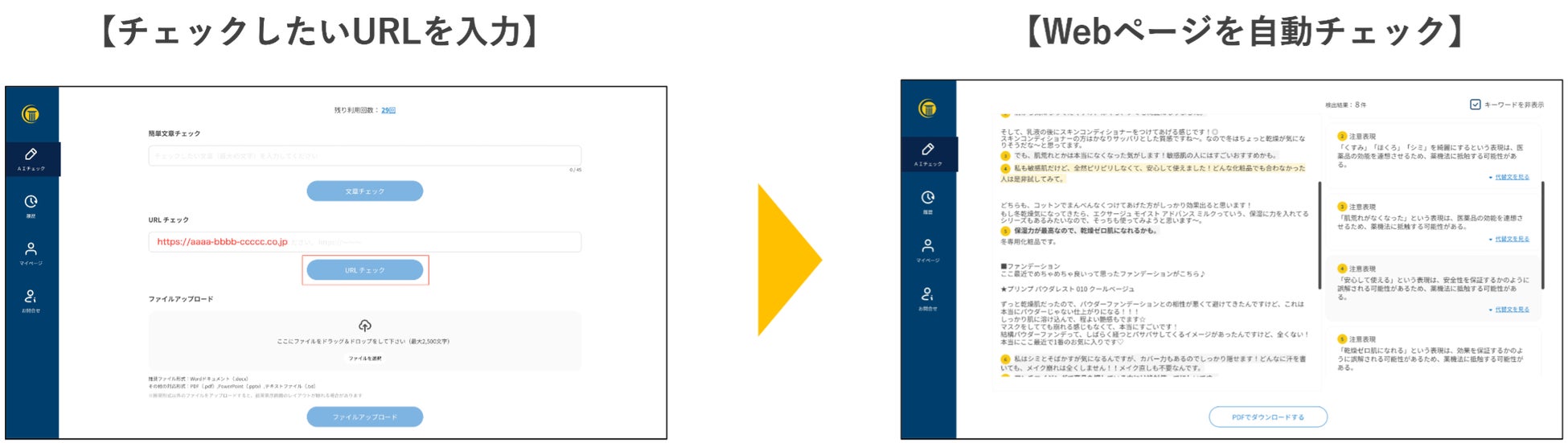 URL入力からの薬機法チェック機能は、ウェブ上の情報を直接解析し、薬機法規制項目に対する適合性を素早くかつ正確に判定します。これにより、企業は製品やサービスに関連する情報をリアルタイムにチェックし、規制項目に対する遵守状況を把握することができます。