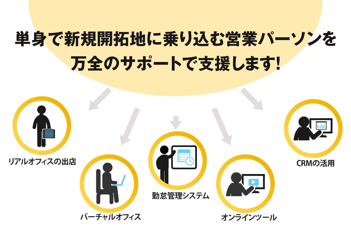 短期間、低価格で全国に拠点を作るための営業支援システムです。単身で新規開拓地に乗り込む営業パーソンを万全のサポートで支援いたします。