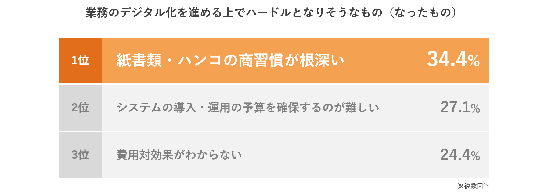 業務のデジタル化を進めるうえでのハードルとなりそうなもの、あるいはなったものは、「紙書類・ハンコの商習慣が根深い」が34.4%で最上位という結果からも、紙書類の課題の根深さが伺えます