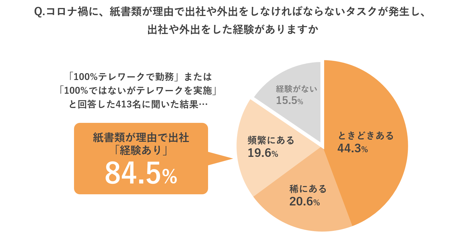 テレワークの実施状況について「100%テレワークで勤務している」または「100%ではないがテレワークを実施している」と回答した413名に対し、コロナ禍の状況下で紙書類が理由で出社や外出をした経験があるかを聞いたところ、「ときどきある」が44.3%、「稀にある」が20.6%、「頻繁にある」が19.6%で、計84.5%が「経験がある」ことがわかりました。