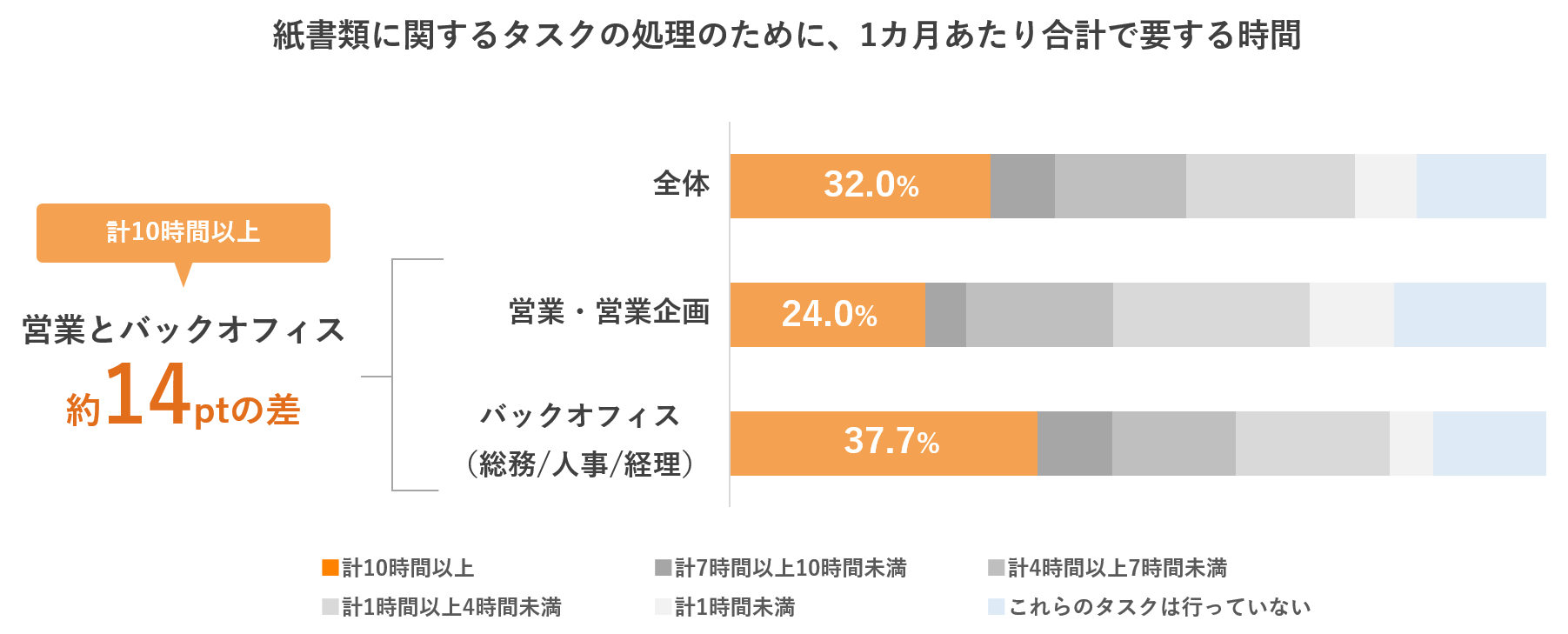 ビジネスパーソンが紙書類のタスク処理に要する1カ月あたりの時間は、「10時間以上」が最も多く全体の32.0%を占める結果でした。「10時間以上」と回答した割合を職種別に比較すると、営業・営業企画部門では24.0%に対し、バックオフィス部門(人事、総務、経理)では37.7%、経理のみでは49.5%と、職種により差があることがわかりました。