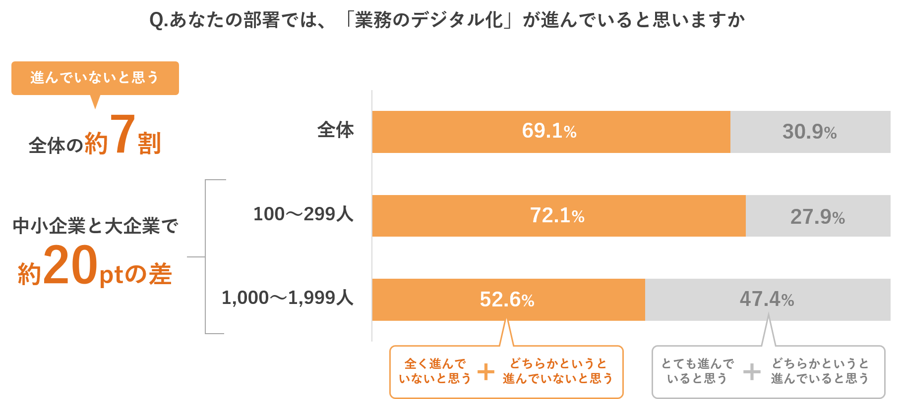 所属する部署において紙書類の電子化やハンコの廃止などの「業務のデジタル化」が進んでいると思うかという質問に対しては、「全く進んでいないと思う」が28.8%、「どちらかというと進んでいないと思う」が40.3%で、計69.1%が「進んでいないと思う」と回答。また、「進んでいないと思う」と回答した割合を従業員数別でみると、100~299人規模では72.1%を占めているのに対し、1,000~1,999人規模では52.6%と、企業規模により業務のデジタル化の推進状況に大きく差があることがわかりました。