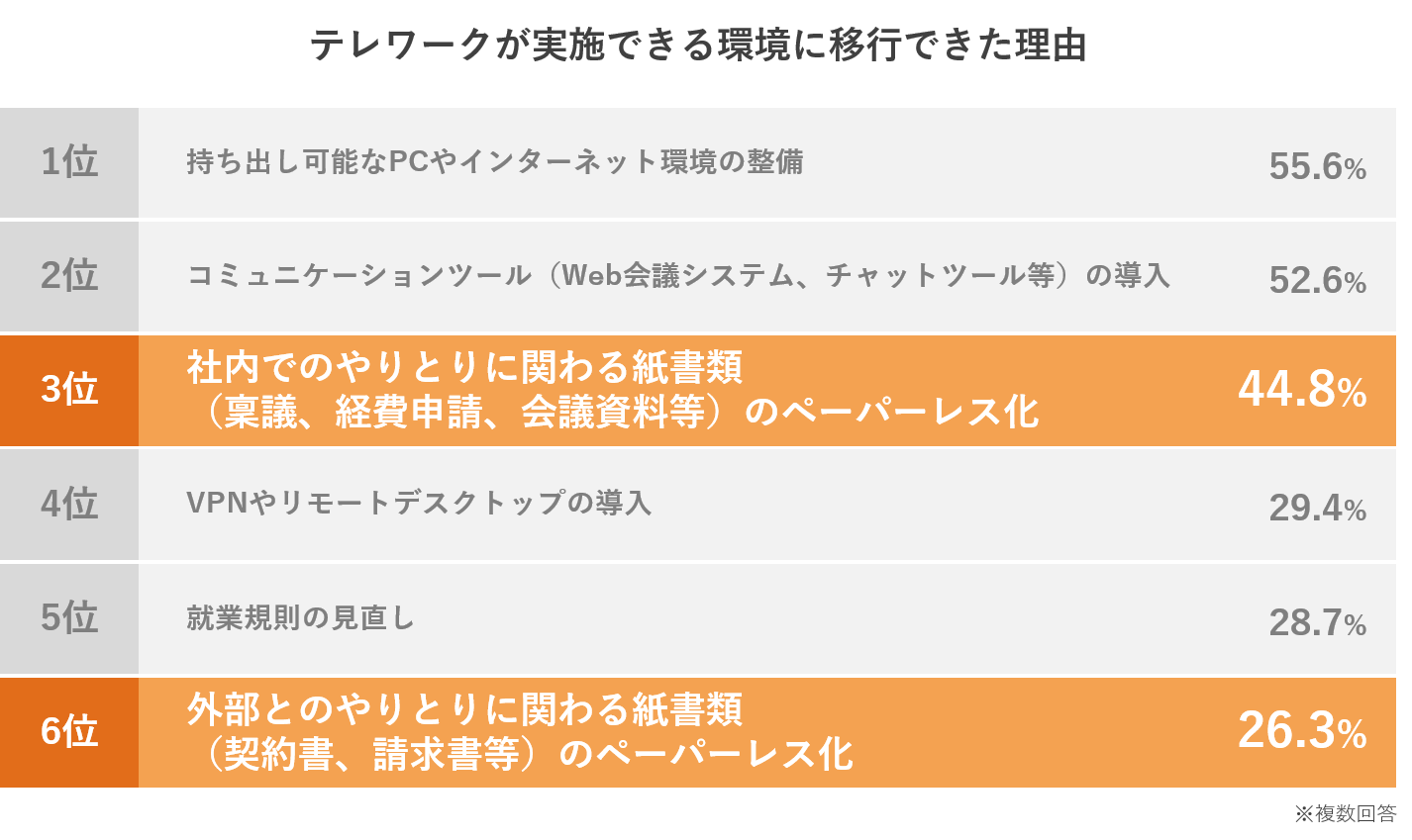 また、テレワークが実施できる環境に移行できた理由として、社内外の紙書類のペーパーレス化が上位に入っています。