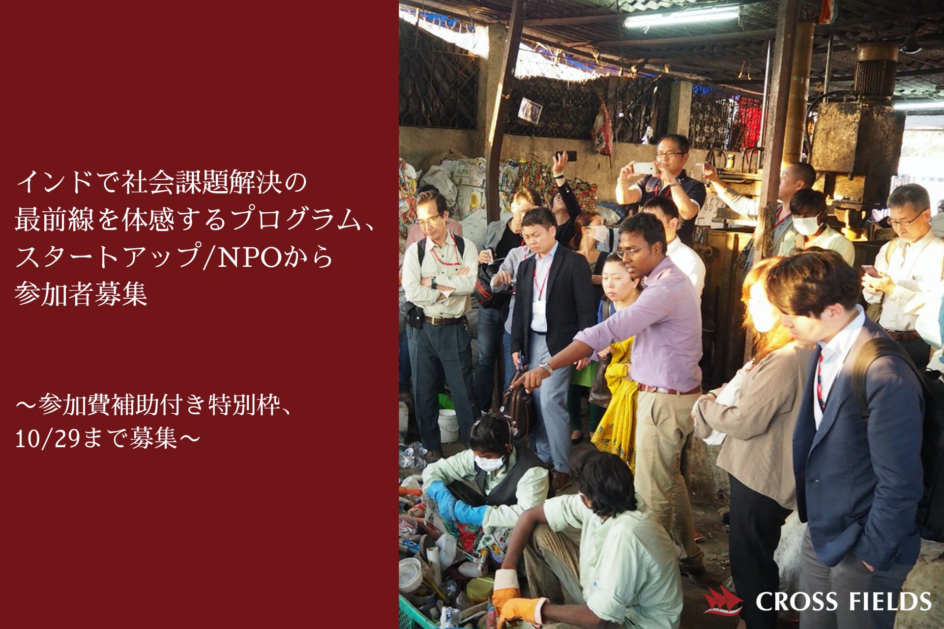 NPO法人クロスフィールズ(東京都品川区、代表:小沼大地)は、インドで社会課題解決に取り組む企業や団体を訪問するプログラム(Social Innovation Mission 2024 in India)を2024年2月に開催します。本プログラムでは初の取り組みとして、スタートアップ/NPOの参加者向けに参加費用を補助する特別枠を設置し、10/29(日)までに3名程度を一般募集します。