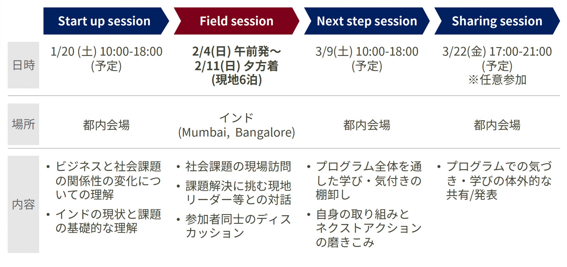 本プログラムは、大企業の新規開発部/研究開発部の役職者らとスタートアップ/NPOの経営リーダー約15-20名が、ムンバイとその周辺の農村部やバンガロールを巡り、様々な社会課題解決のあり方を体感するものです。社会課題の現場やテクノロジーを活用した最先端の課題解決を行う団体視察、そして現地リーダーとの対話を通じ、参加者それぞれが自身や自社のビジネスの未来を描いていく、約1週間のプログラムとなっています。(フィールドセッション:2/4〜2/11。ほか、都内での事前/事後セッションを各1日オフラインで開催予定)